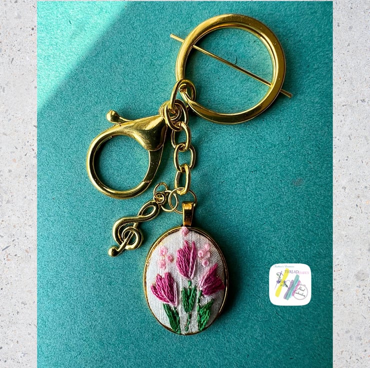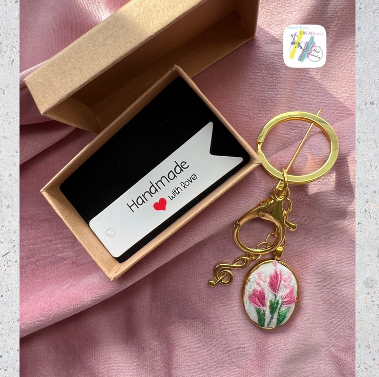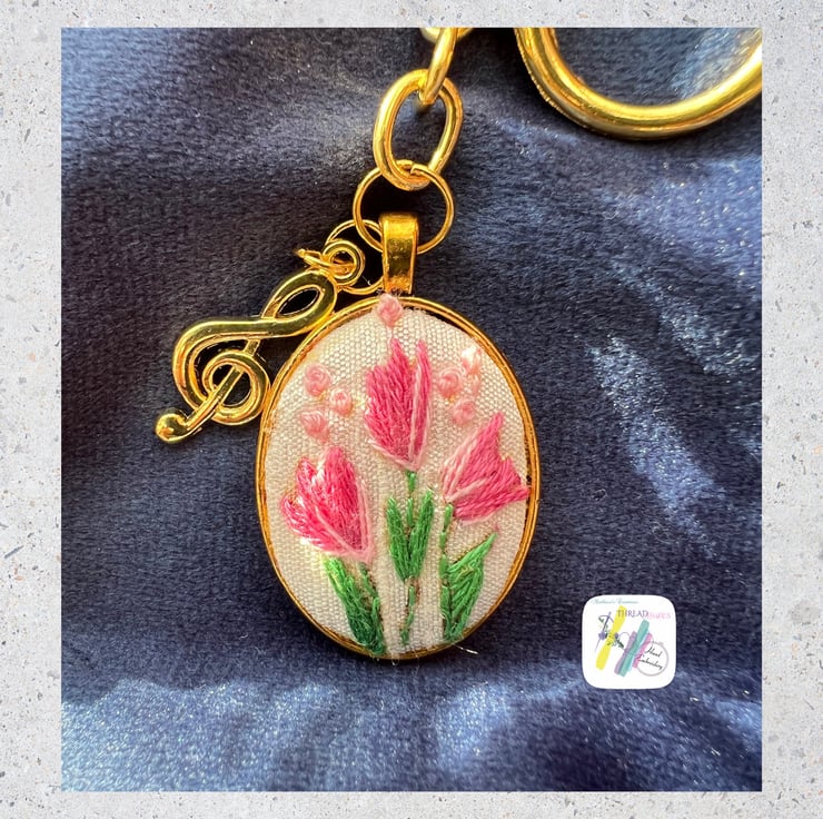 Beautiful pink tulips design embroidered on raw silk fabric. Used good quality pendant frame and key ring.
