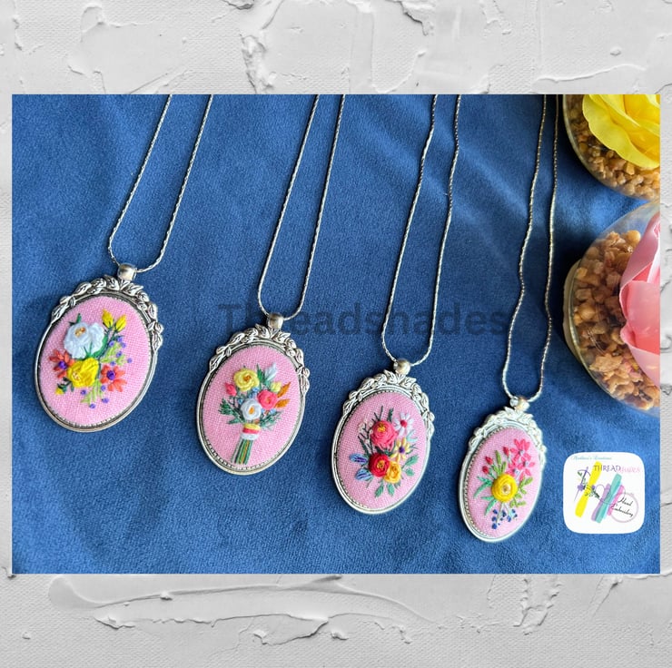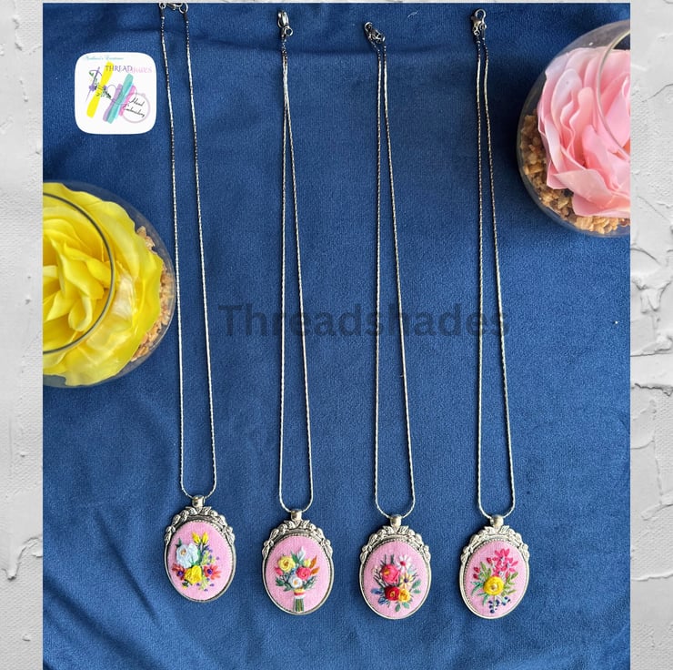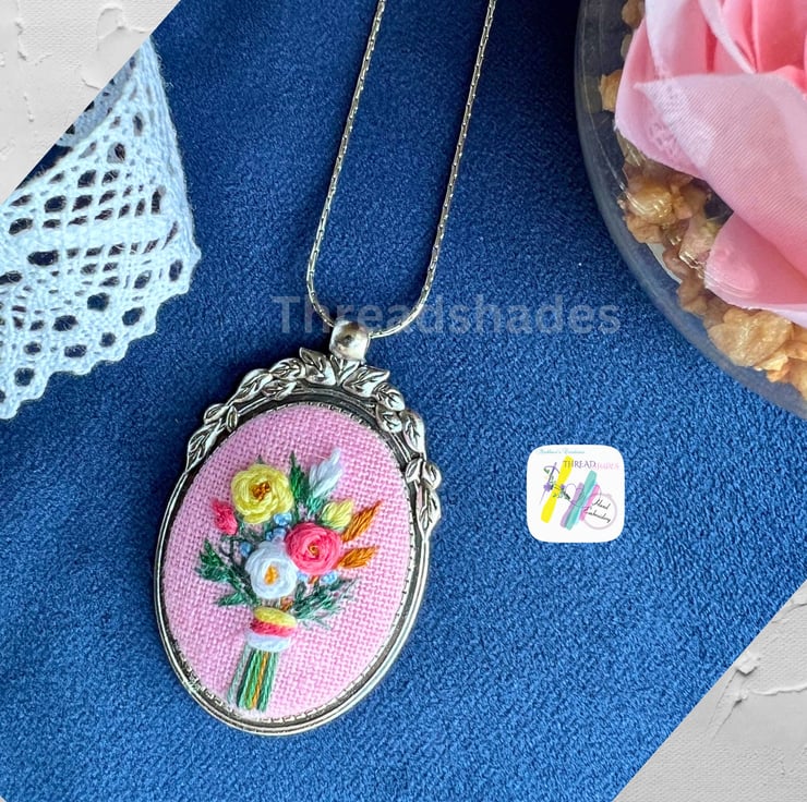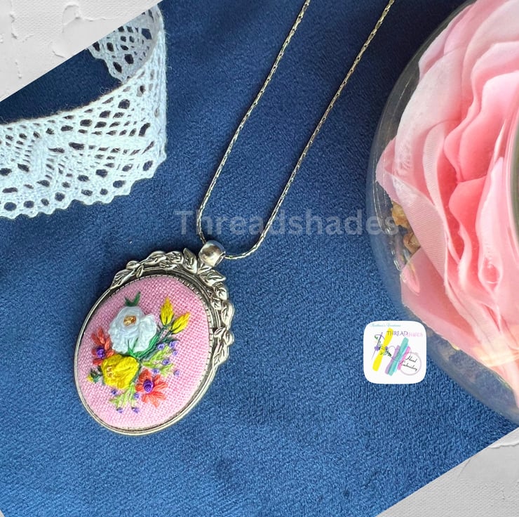 Details:- Very beautiful Antique silver look vintage style floral pendant is ready to ship! Pink cotton base fabric and DMC threads embroidery work done using different stitches and beautiful colour combinations! Suitable for gifting or add to your jewellery collection!