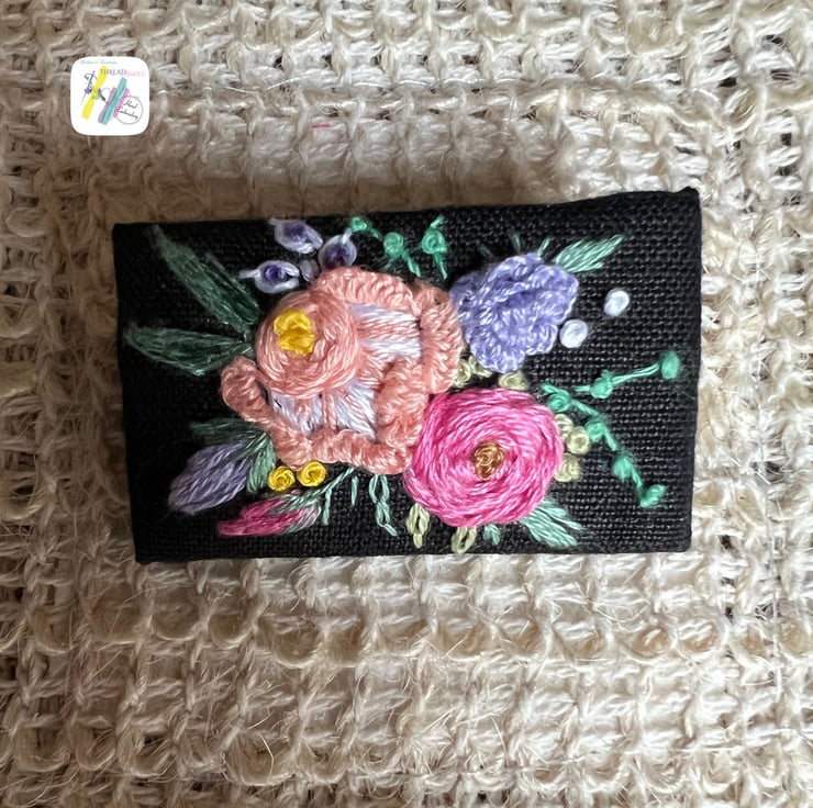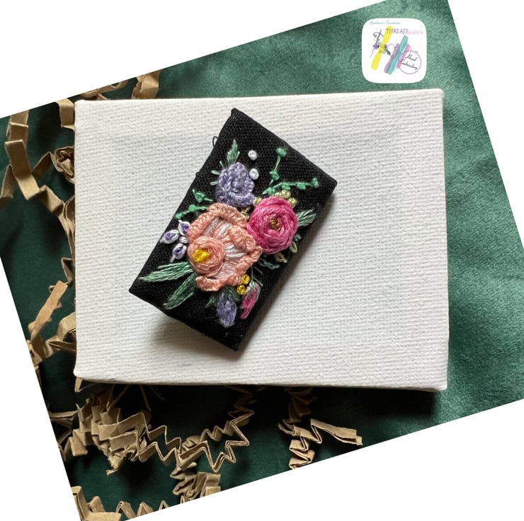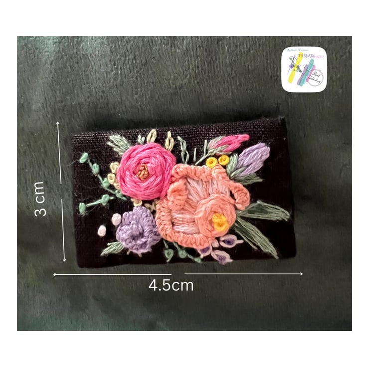 Beautiful floral hand embroidered brooch to enhance your beauty! Black linen fabric base and embroidered with DMC cotton threads, ideal for gifting, very finely embroidered with different stitches and detailing, beautiful colour combinations and evergreen floral beauty!