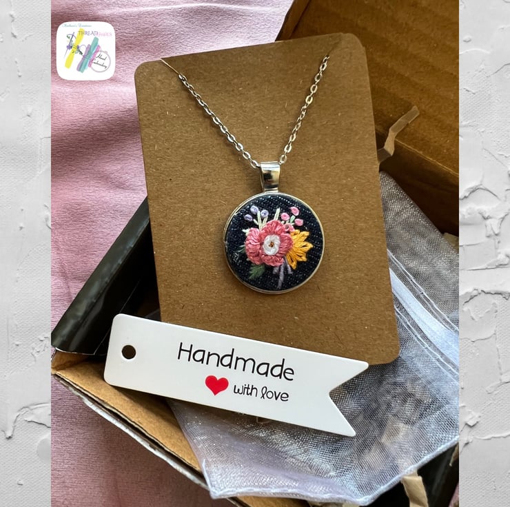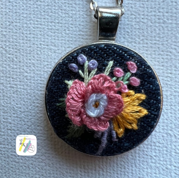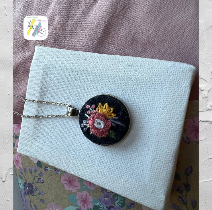 Description:- It is beautiful silver colour tray denim fabric hand embroidered pendant with rose and other beautiful floral embroidery. Ideal for gifting or add to your jewellery collection. Embroidered on denim fabric with DMC cotton embroidery threads. Ready to dispatch .