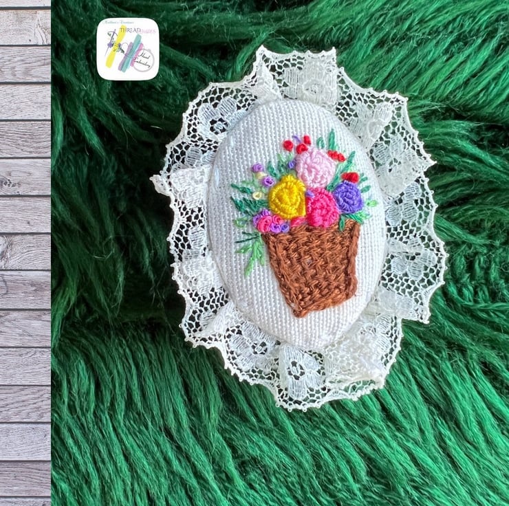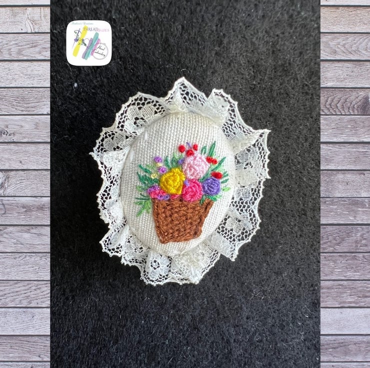This is beautiful floral basket design hand embroidered brooch.