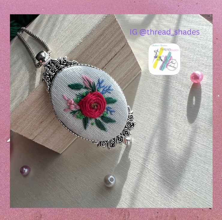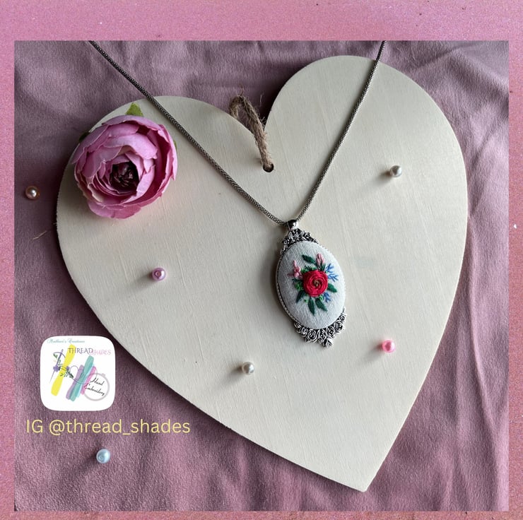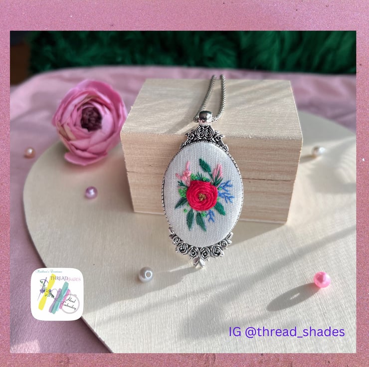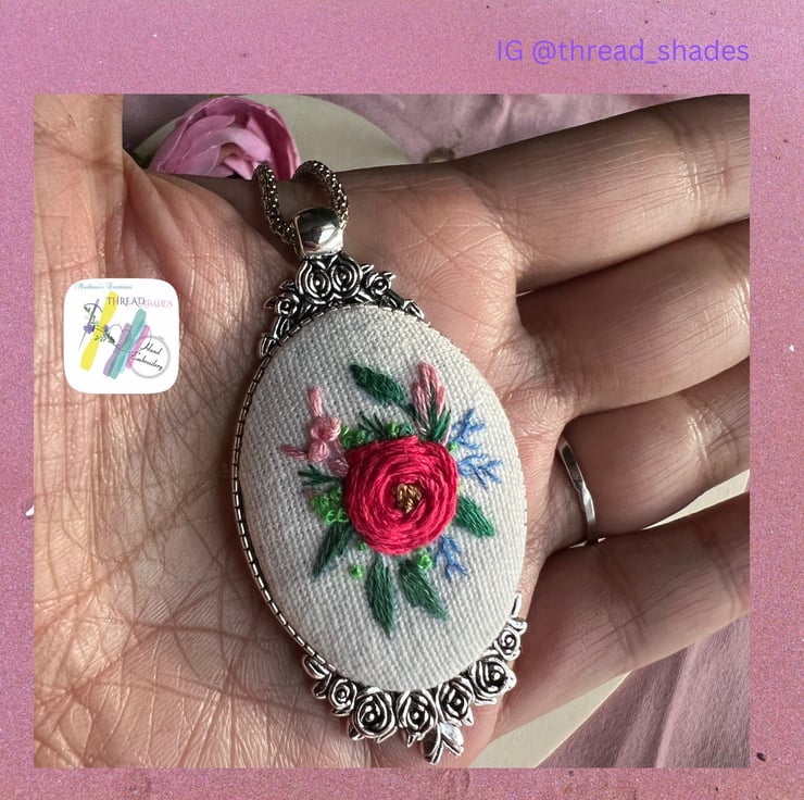 Beautiful rose embroidery pendant is ideal for gifting or for adding in your jewellery collection.
