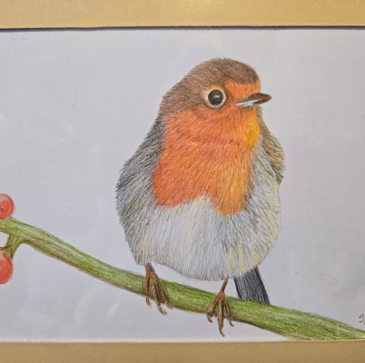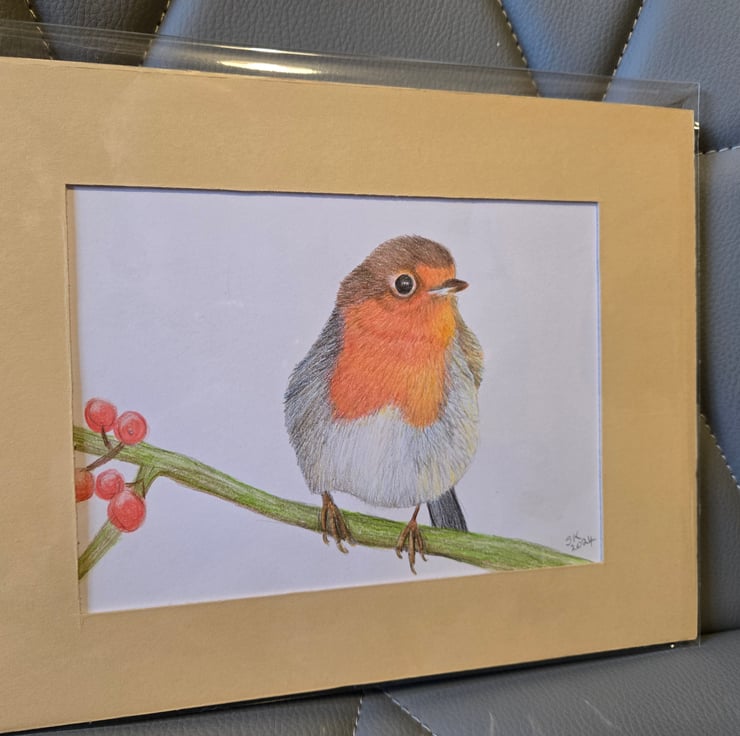 This is an original colour pencil drawing of a beautiful robin on white paper, and is in a dark cream mount. Size 9" x 7" (approx).
