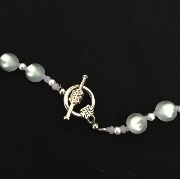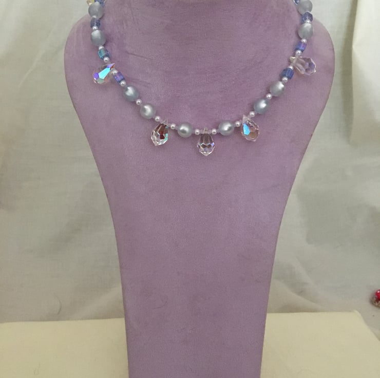 Pretty Beaded Necklace – hand strung with beautiful glass beads and glass pearls in clear and barely there soft blue colour tones with sliver plated fastening.