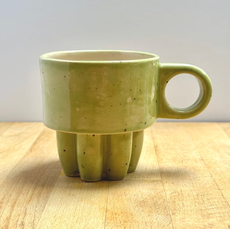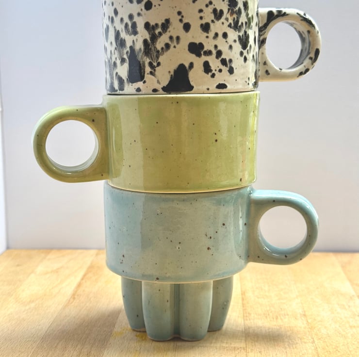 Handmade stackable stoneware ceramic mugs and coffee cups in a translucent green speckled glaze.