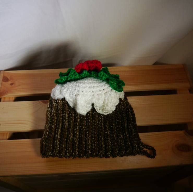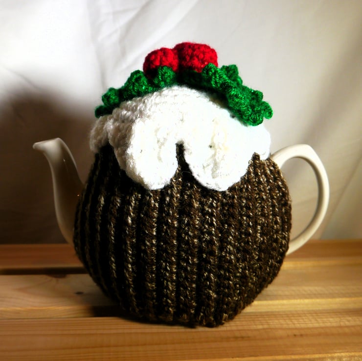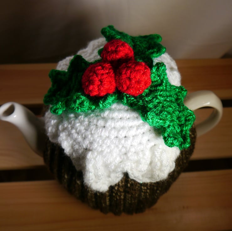 This stunningly cheerful woolly warmer would make a fabulous addition to any festive tea tray. Created using two strands of rich coloured acrylic wool it has a pleasing natural tone. Combining two strands gives a thicker cosy to help keep your brew at ideal temperature, and the ridged texture provides a little stretch and interest to the design. The cosy has than been adorned with icing and holly make from yarn with a hint of sparkle to complete the jolly look of a Christmas pudding. There is a generous spout hole on one side to the cosy and on the opposite side has been created open with a loop and vintage button fastening to secure around the handle. measuring approximately 8 inches (20cm) across and 8 inches (20cm) tall, it is demonstrated here on a teapot with 4 cup capacity (36oz just over 1liter). I would recommend washing by hand if required, created in a smoke and pet free home. Teapot not included.
