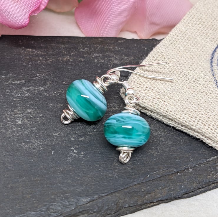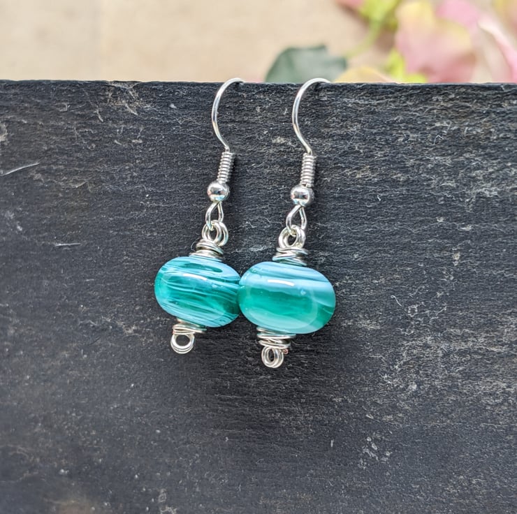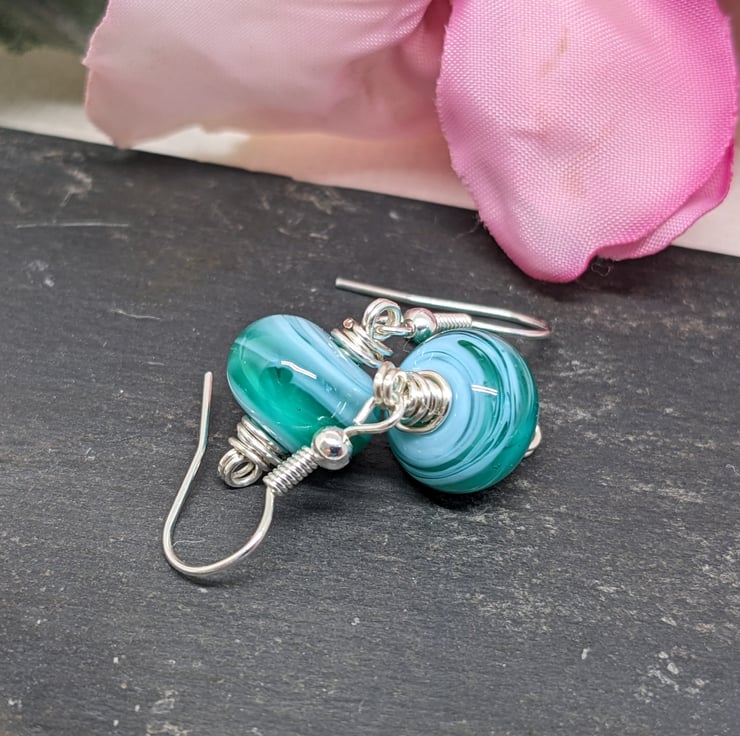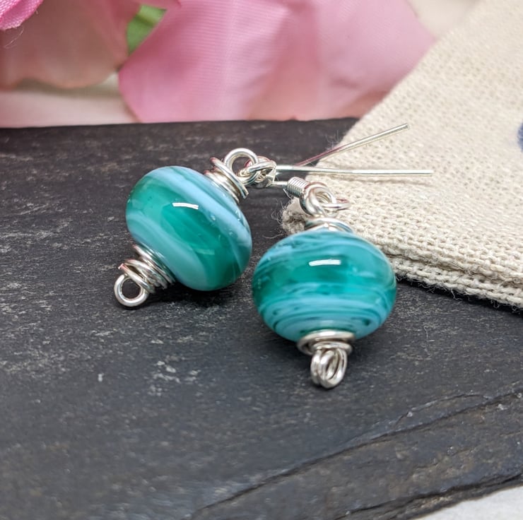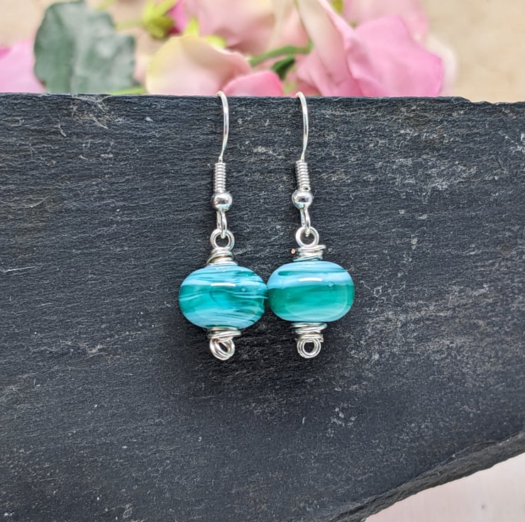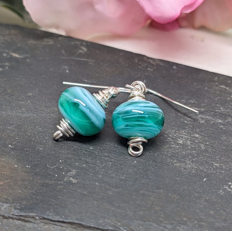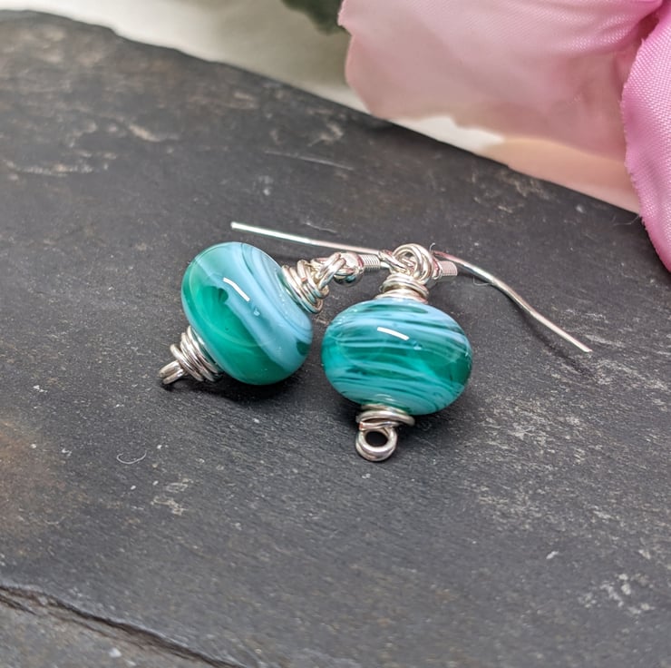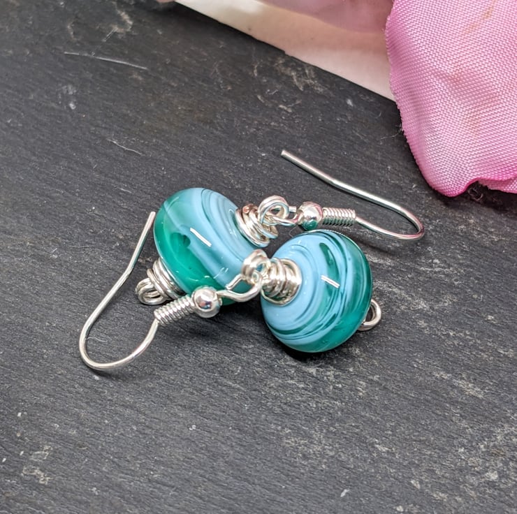 These earrings feature handmade lamp work beads which have an emerald green base with a swirly white pattern. They've been teamed with my own messy wire work and silver plated ear wires.