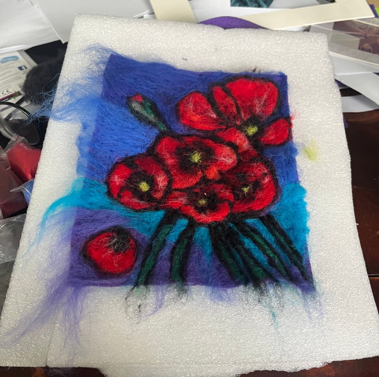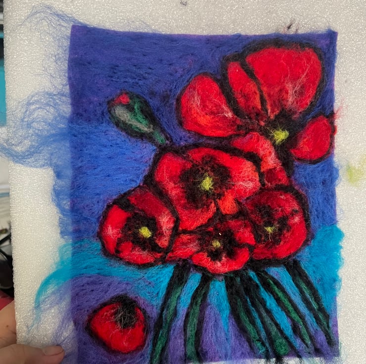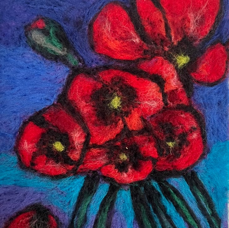A 15 x 15cm piece showing a bunch of red poppies against a blue and purple background. Symbols of Spring and Spring Colours Wool painting and needle felted. Comes backed and mounted.