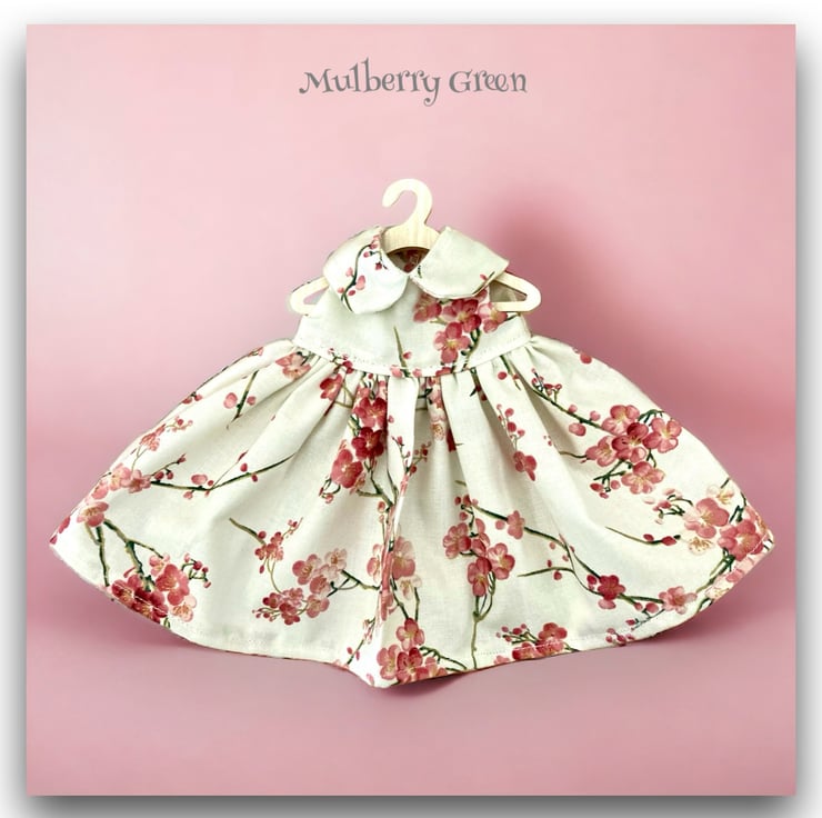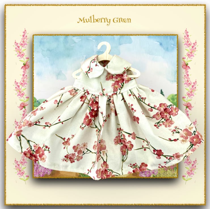A pretty ivory dress in a cherry blossom print, to fit the Mulberry Green characters. The dress is made from best quality cotton and has a Peter Pan collar and a lined bodice.