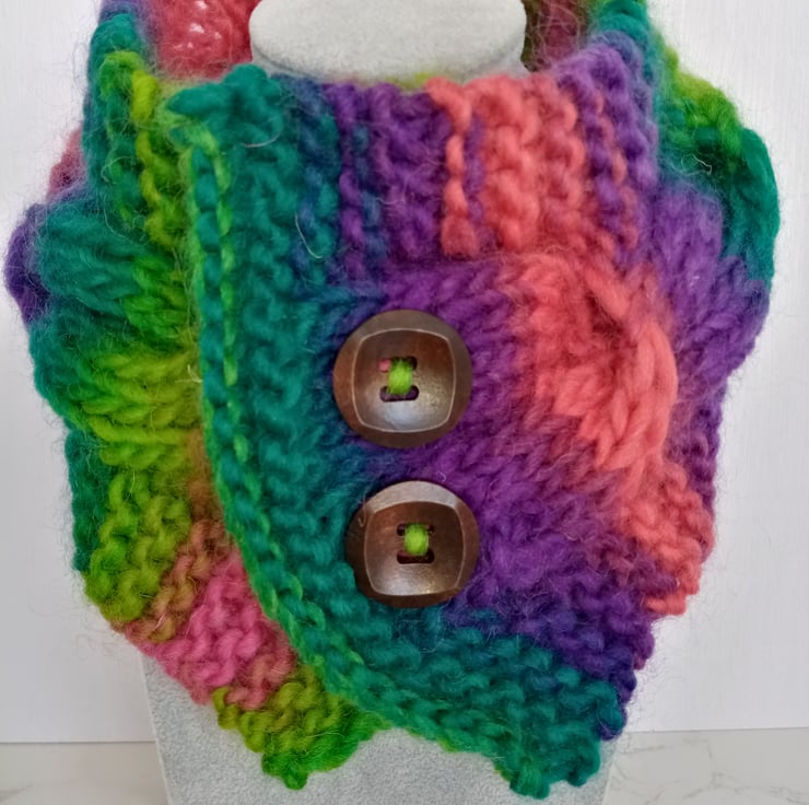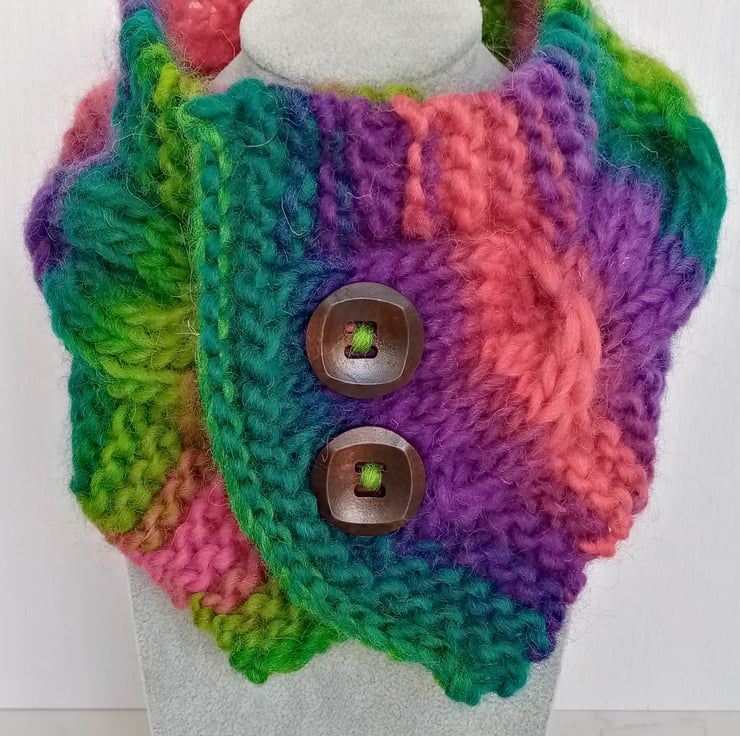 Cable knit neck warmer rainbow multi-colour with dark walnut button closing.