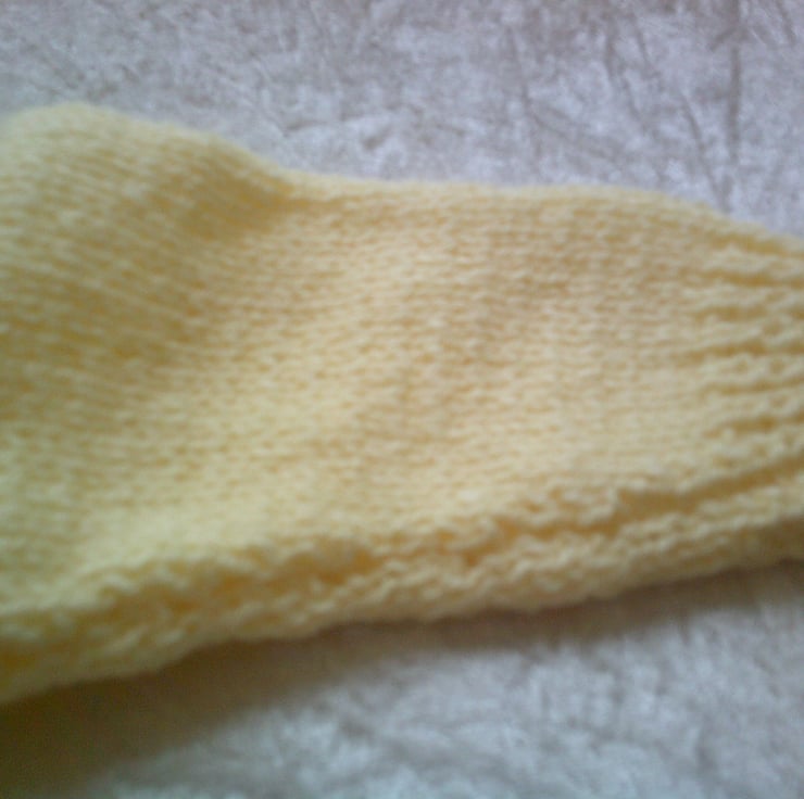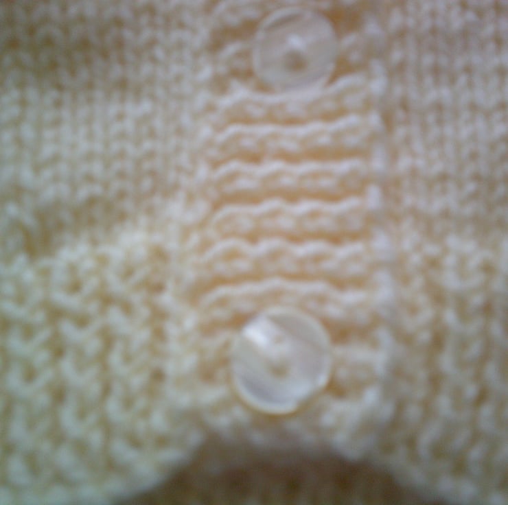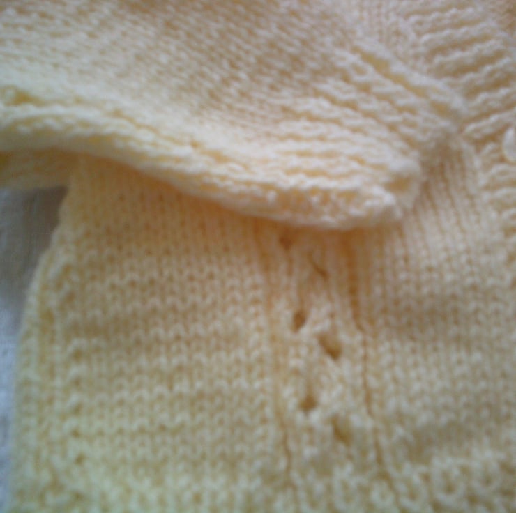 This hand knitted Lemon flecks V Neck cardigan would make an ideal addition to a child's wardrobe. The design is has a lacy panel up the fronts along with raglan sleeves