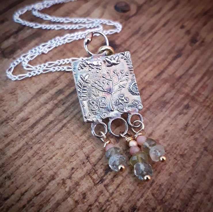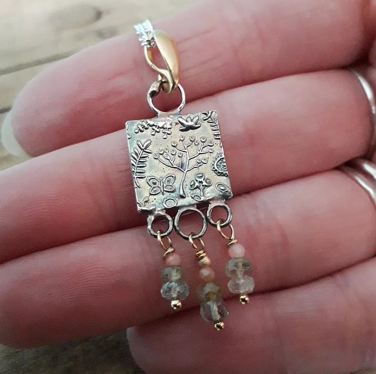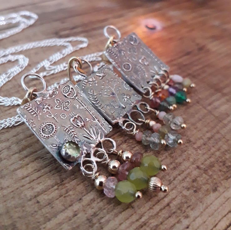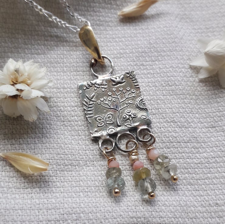 Materials used: Eco fine silver, sterling silver, gold vermeil, gold filled, blue and green tourmaline, pink opal.