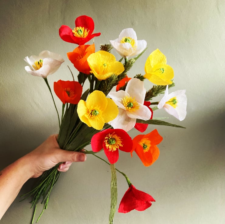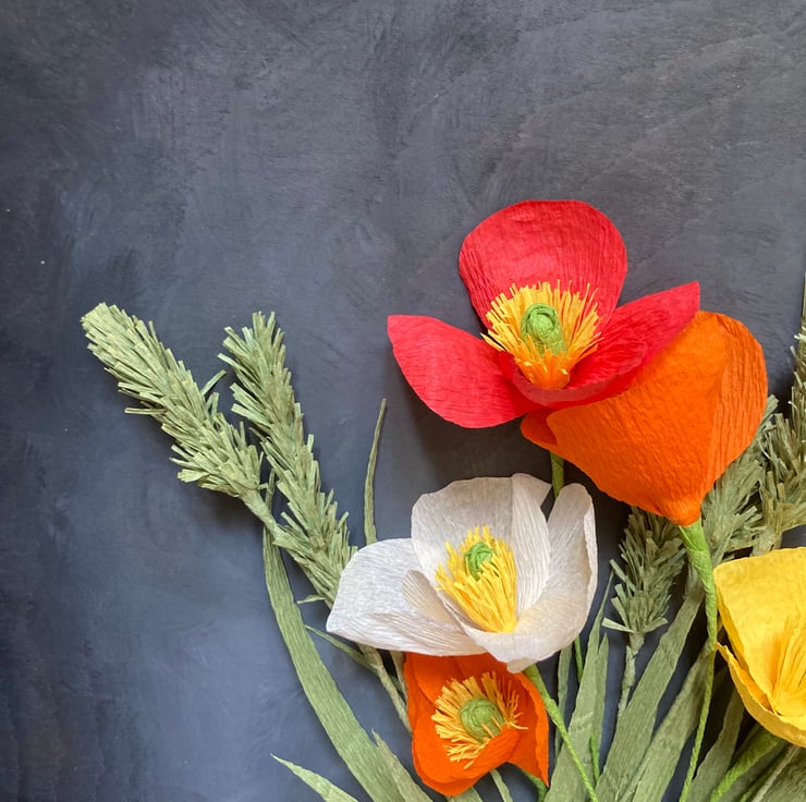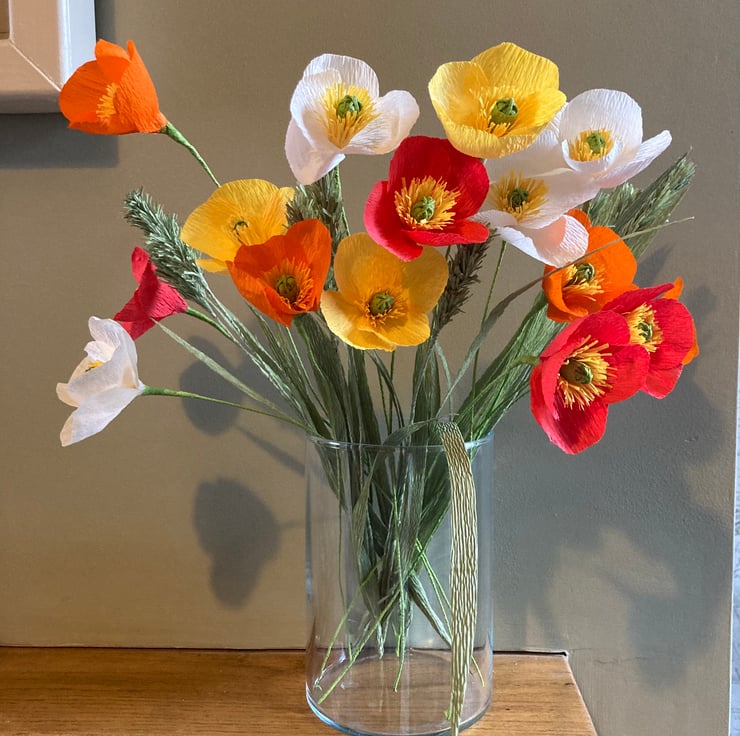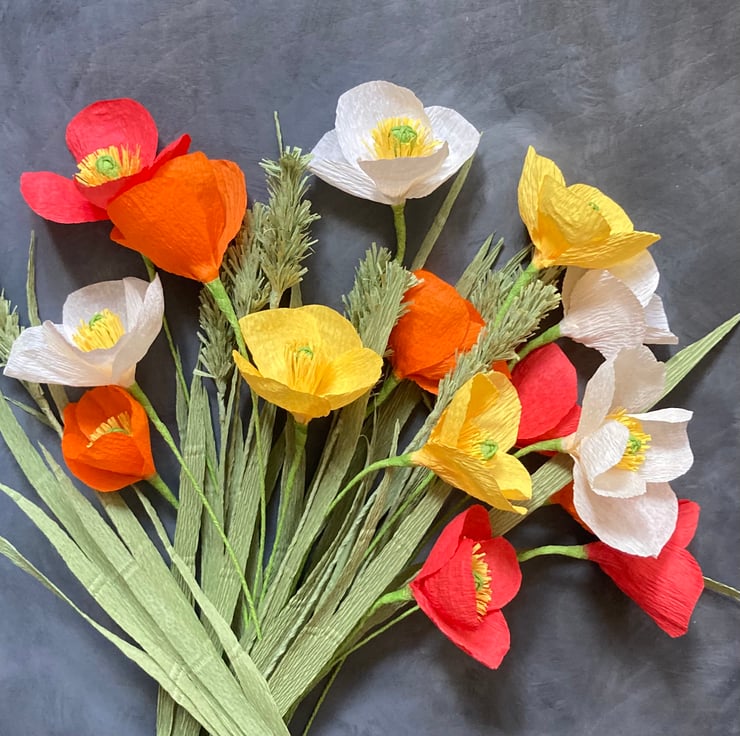 Crepe paper poppies in red, white, yellow and orange, arranged with paper grass in a beautiful bouquet!