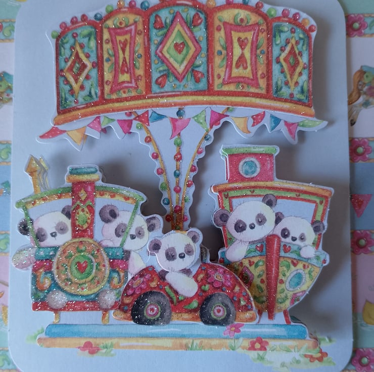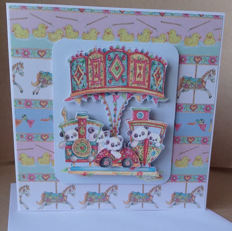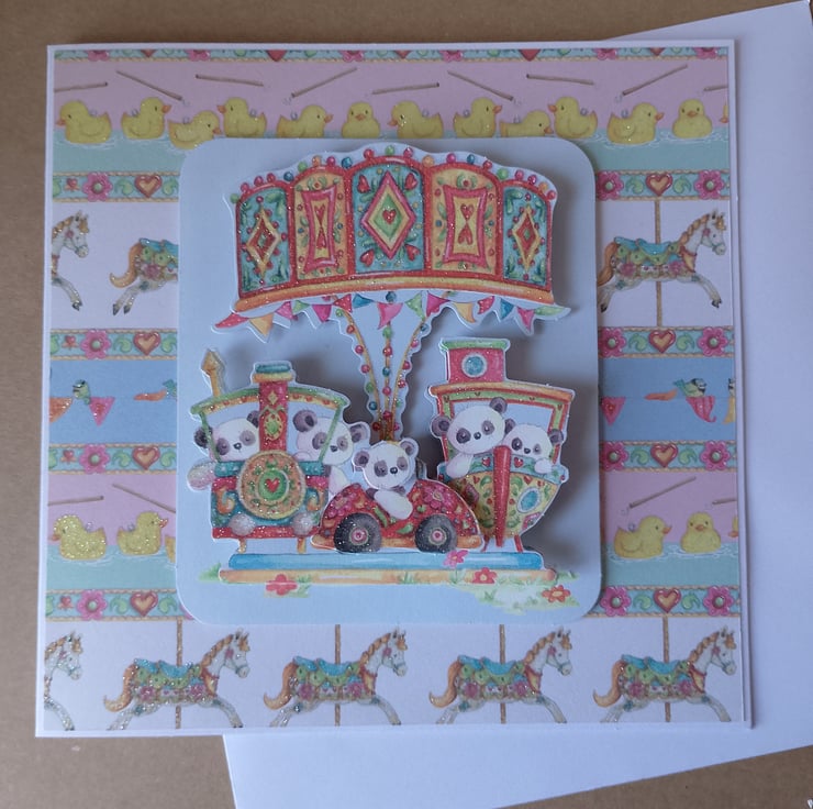 The Carousel Ride card is approximately 6" x 6" and is made using designer background papers and glitter decoupage 3D elements from the Fun Fair range.
