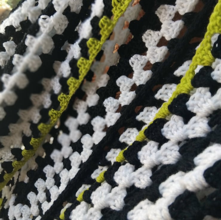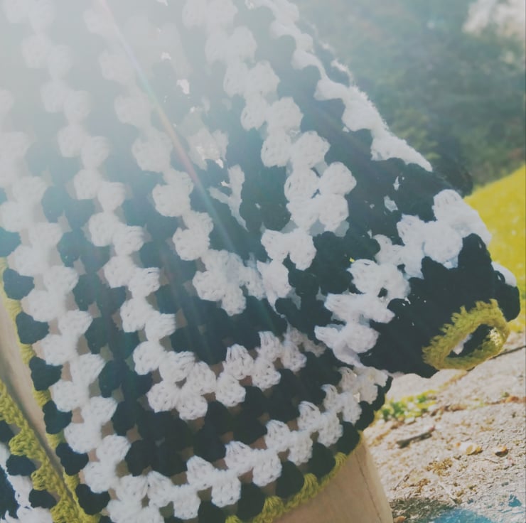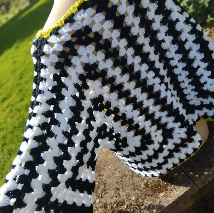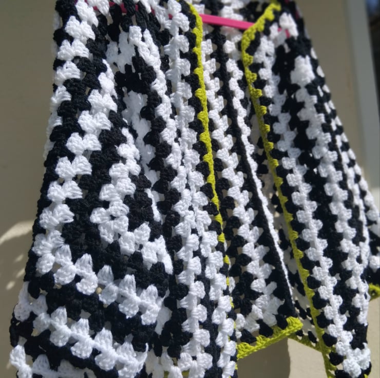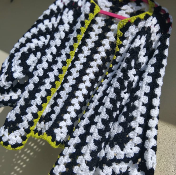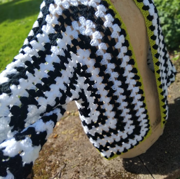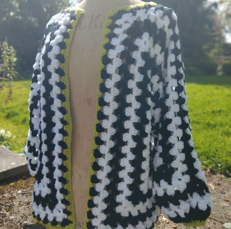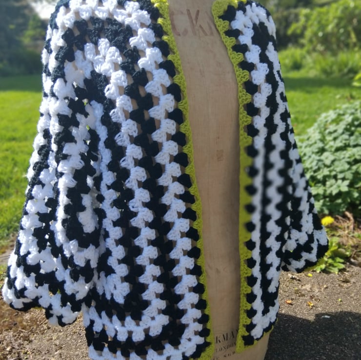 Eye catching black and white yarn with a mouthwatering touch of green makes this unmissable piece.