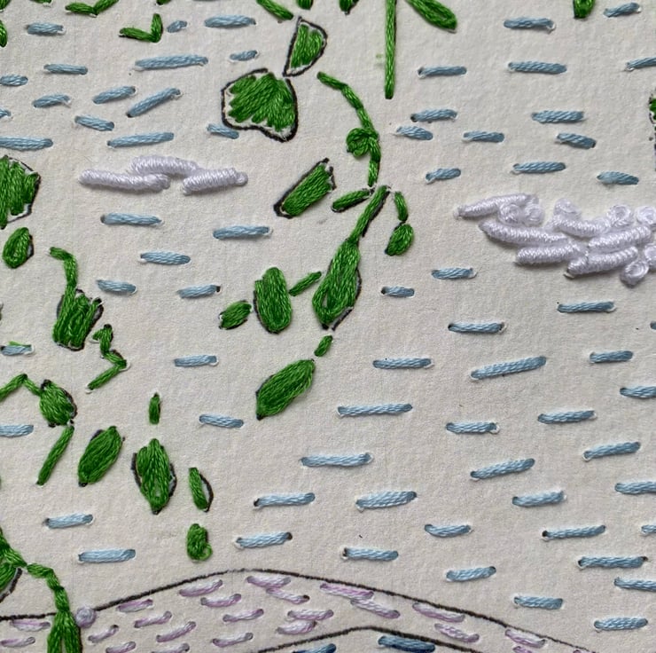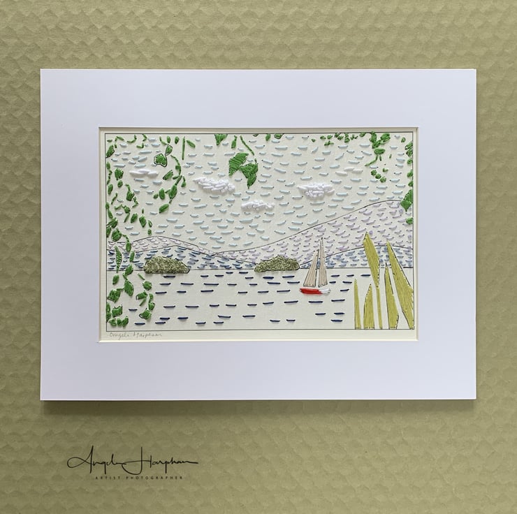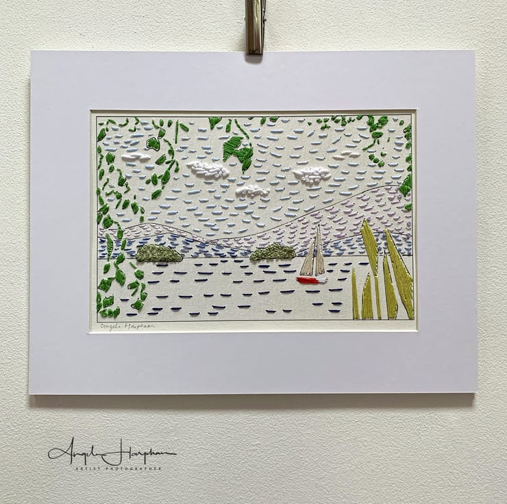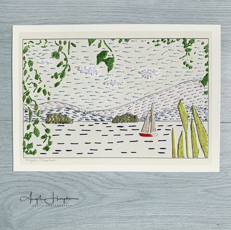 Print from original drawing with hand embroidery of Lake Windermere. This hand embroidered embroidered print is on good quality 300gsm paper.
