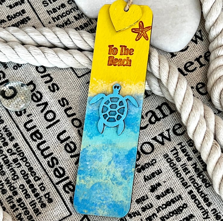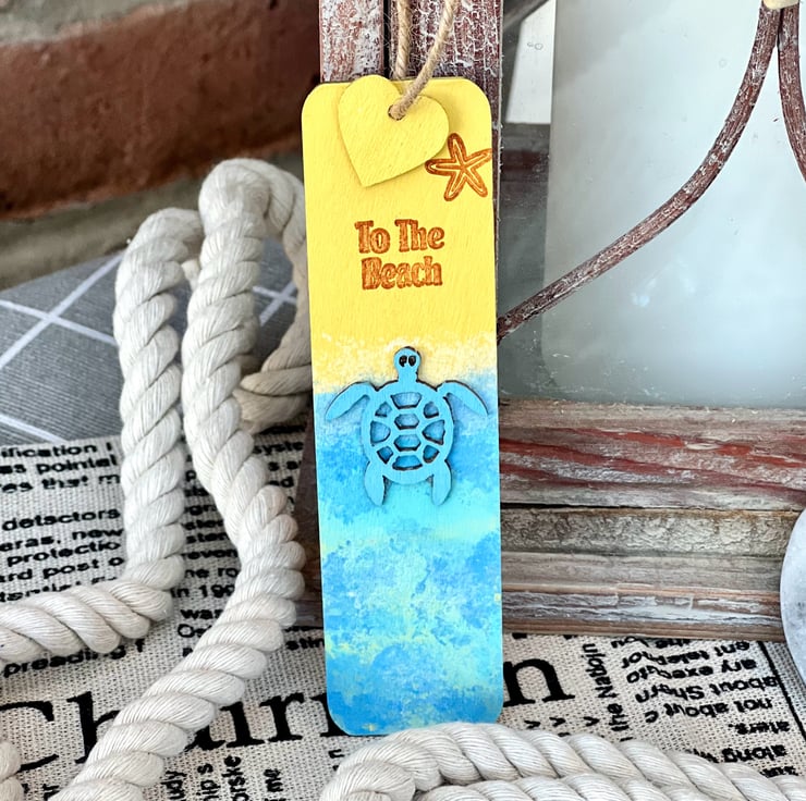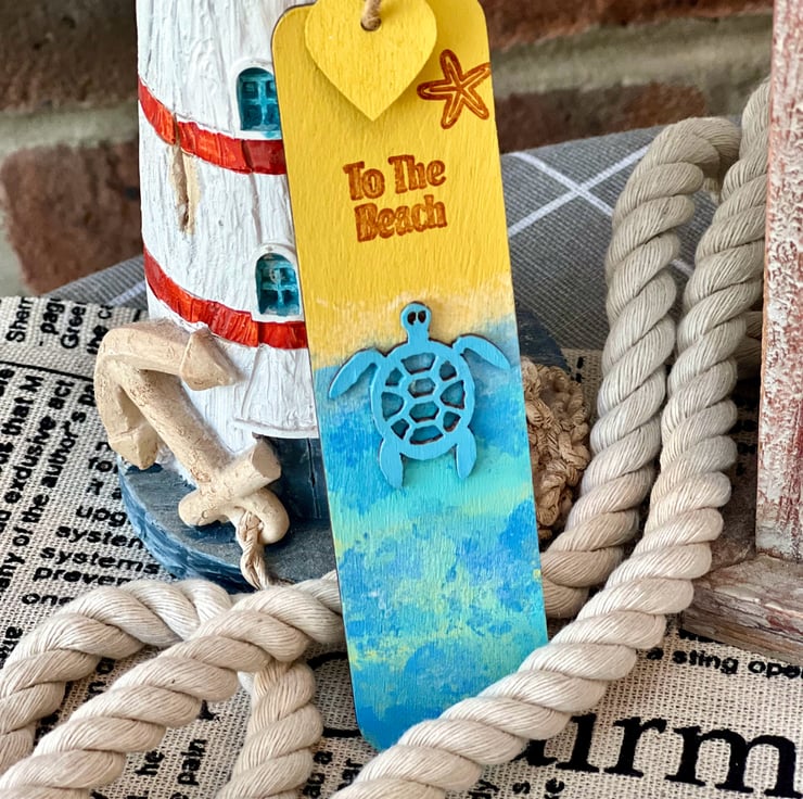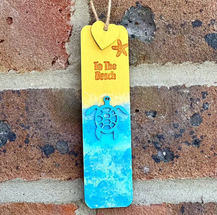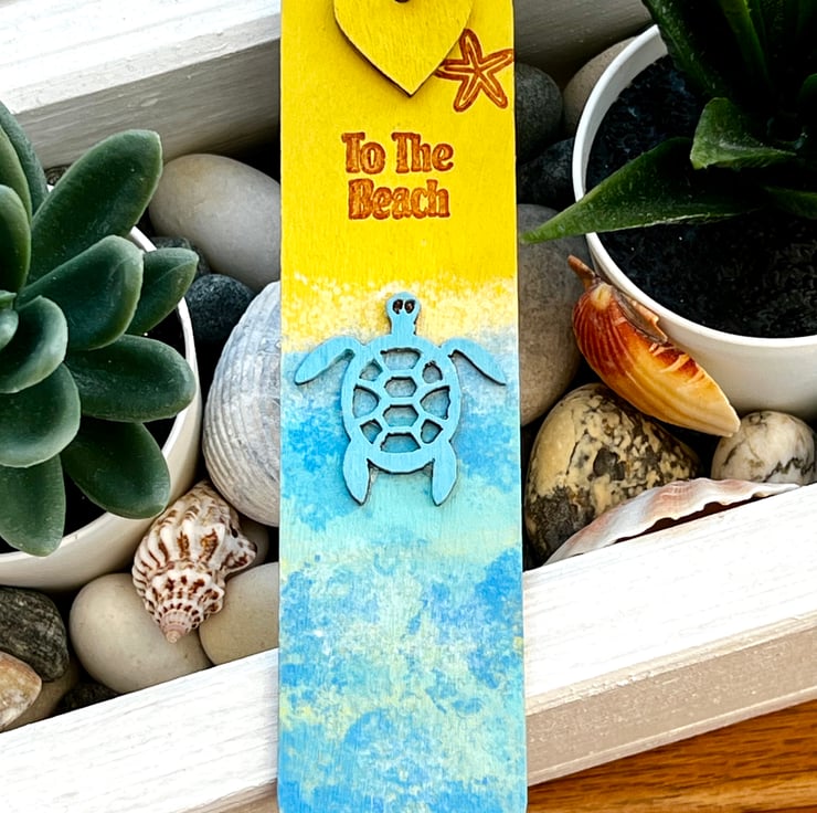 Wooden bookmark, seaside themed ‘To the beach’ with turtle.