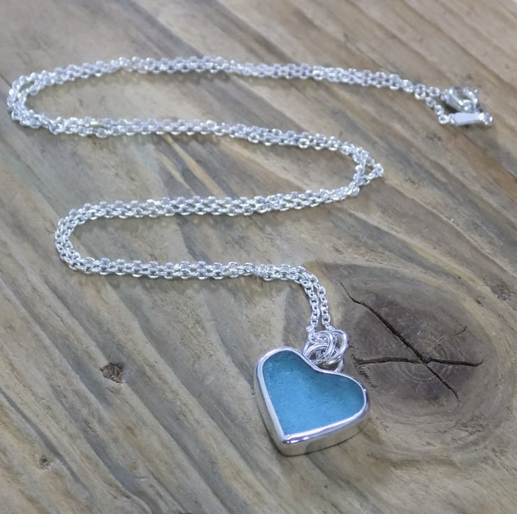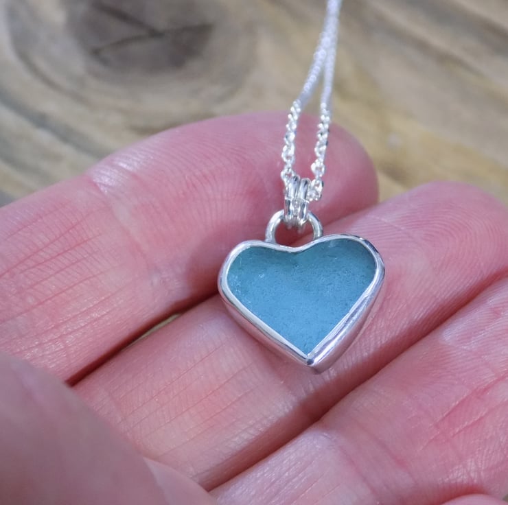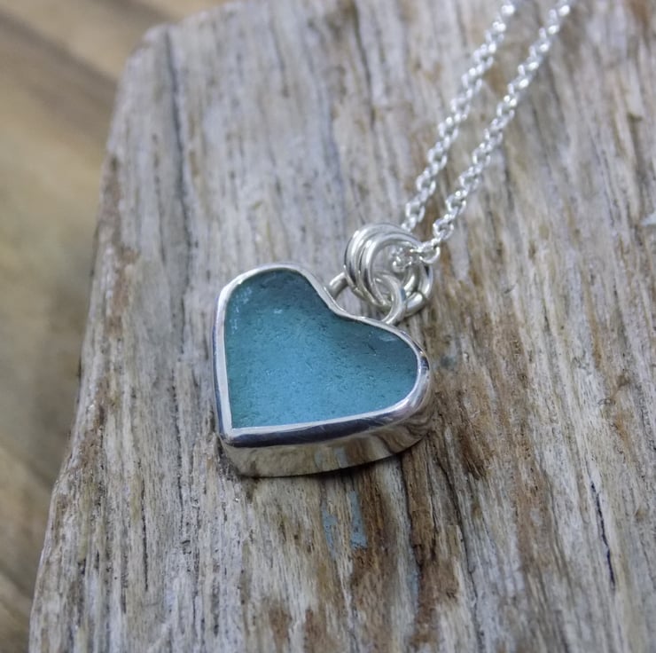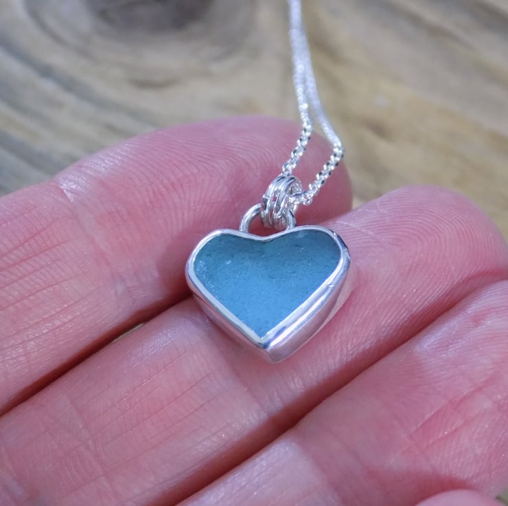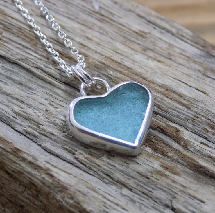 Made from silver and sea glass. A flat piece of sea glass was shaped into a heart using various cutting tools, and set in silver using traditional silversmithing techniques. A lovely dainty piece polished to a high shine. Suspended on an 18 " diamond cut sterling silver trace chain.