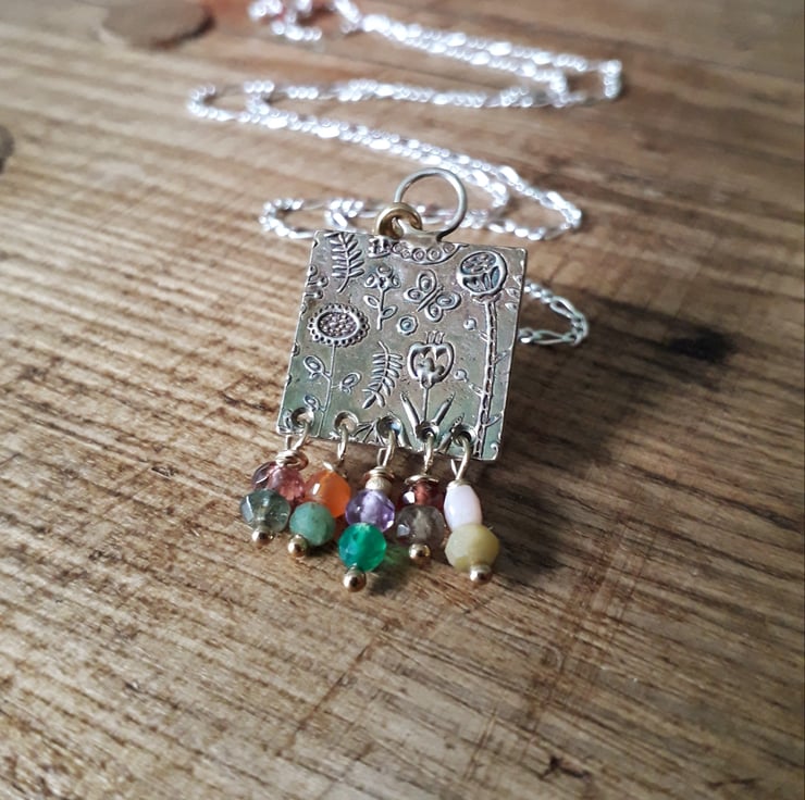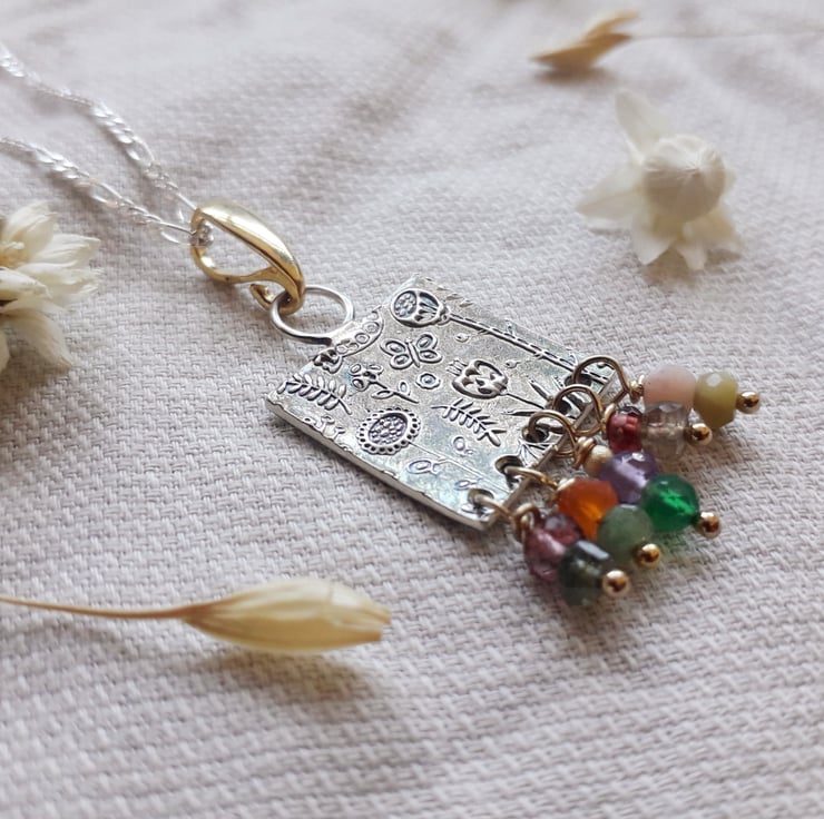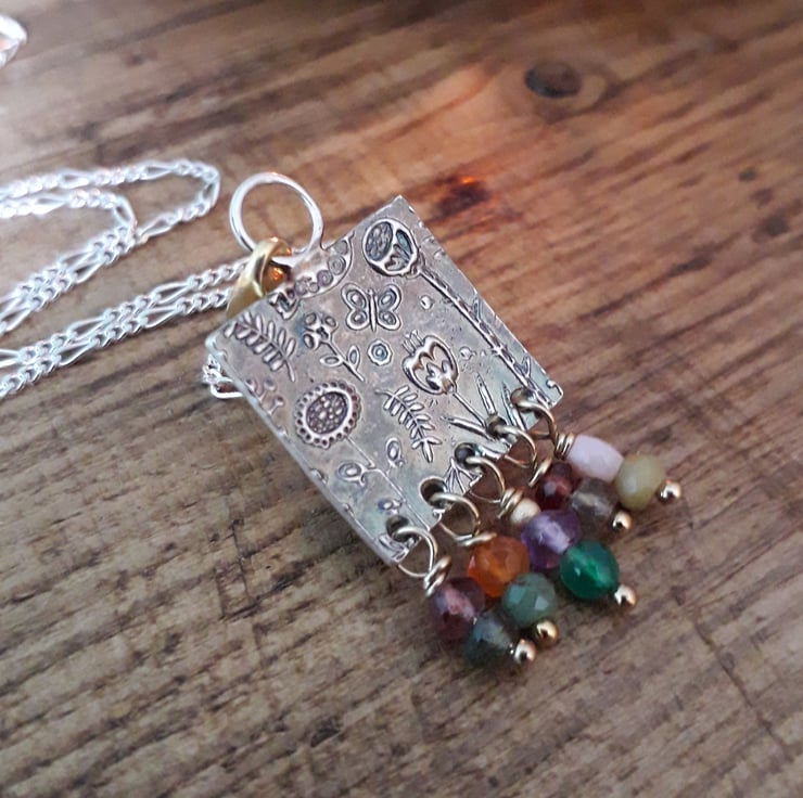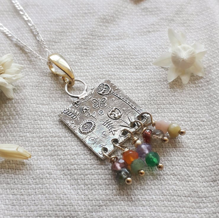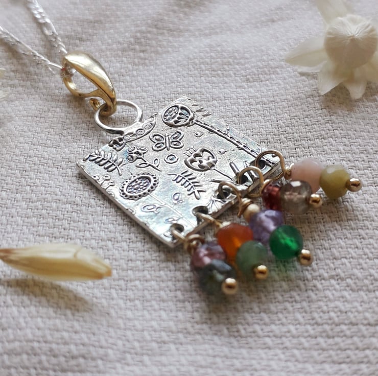 This flower pendant has a subtle dark patina with hints of ochre, grey and green. I paired it with a colourful mix of precious gemstone beads. The gemstones hang on gold filled ball pins. The bail is gold vermeil. The pendant is 0.7 inch (1.7cm) wide and 2 inches (5cm) long. The Figaro chain is 18inch (45cm) long.