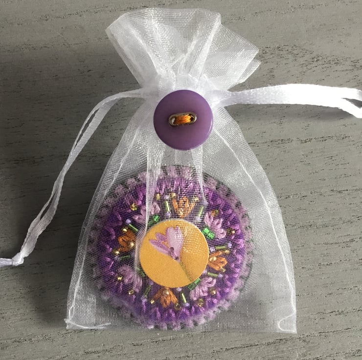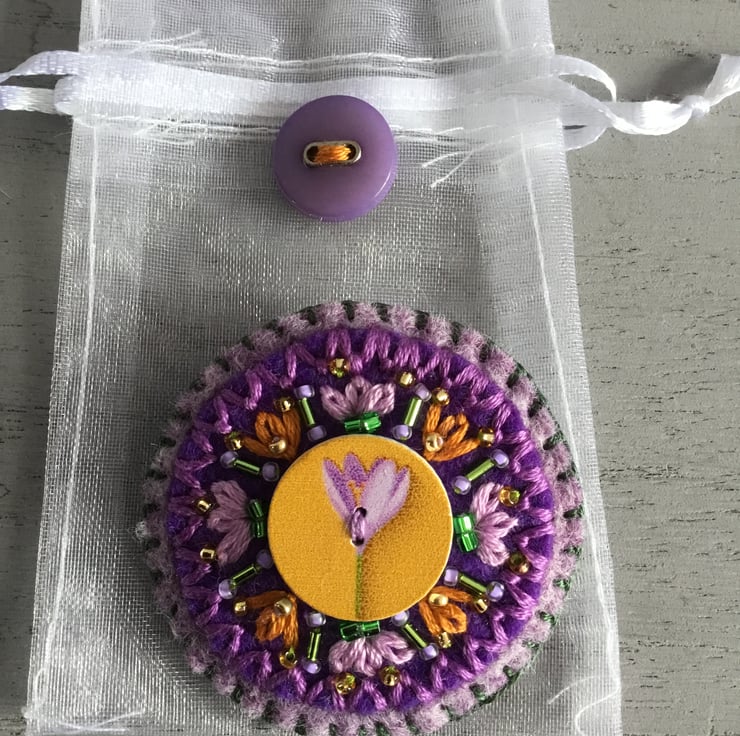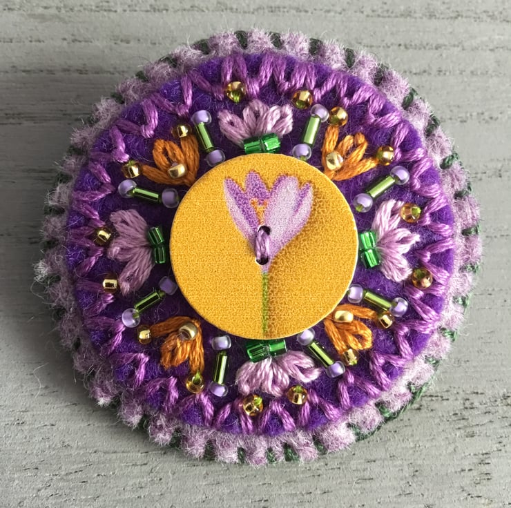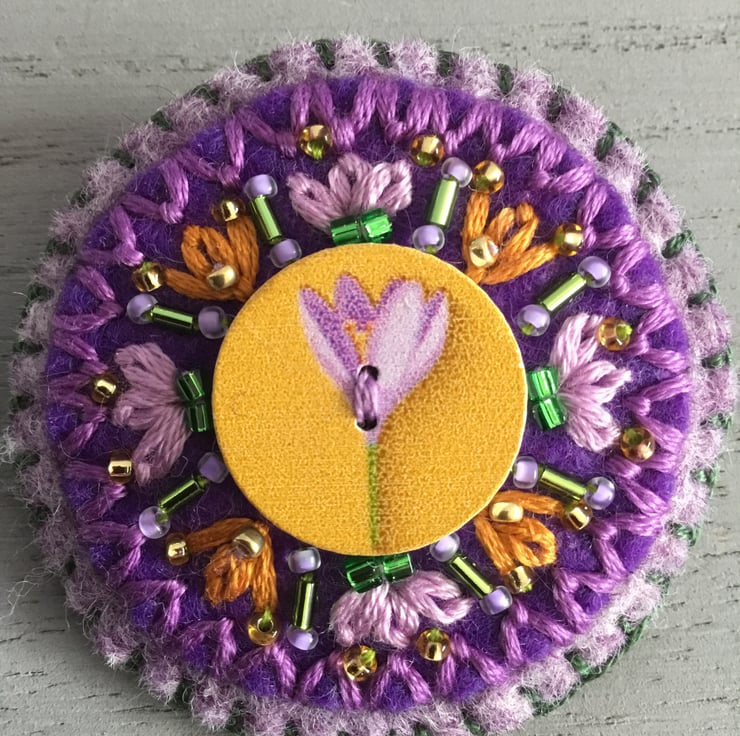This Hand Embroidered Crocus Brooch has a wooden button of a Crocus flower in lovely lilac and golden yellow colours in the centre. It’s sewn onto circles of purple and lilac felt, edged with green Blanket Stitches. Hand Embroidered Lazy Daisy Stitches in lilac and golden brown with green, lilac and golden seed and bugle beads, radiate from this button.