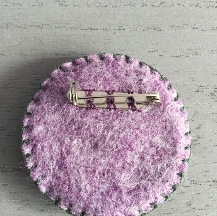 This brooch is 5 cms ( 2 inches) in size…..a nice wearable size. A metal brooch pin with a safety catch is sewn onto the back. This brooch will brighten up any jacket, coat, jumper, dress or cardigan.