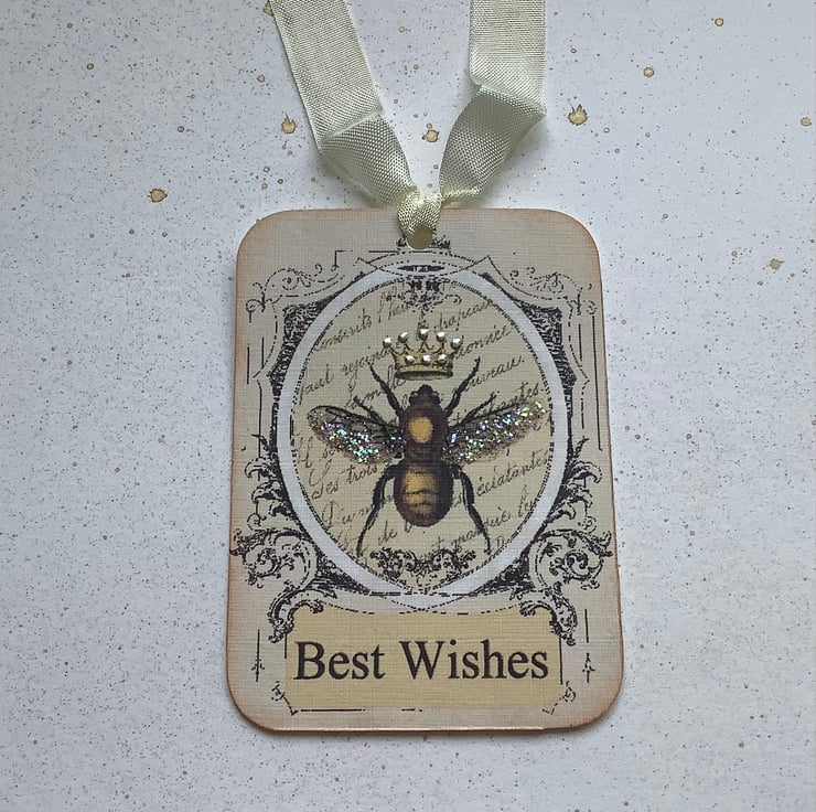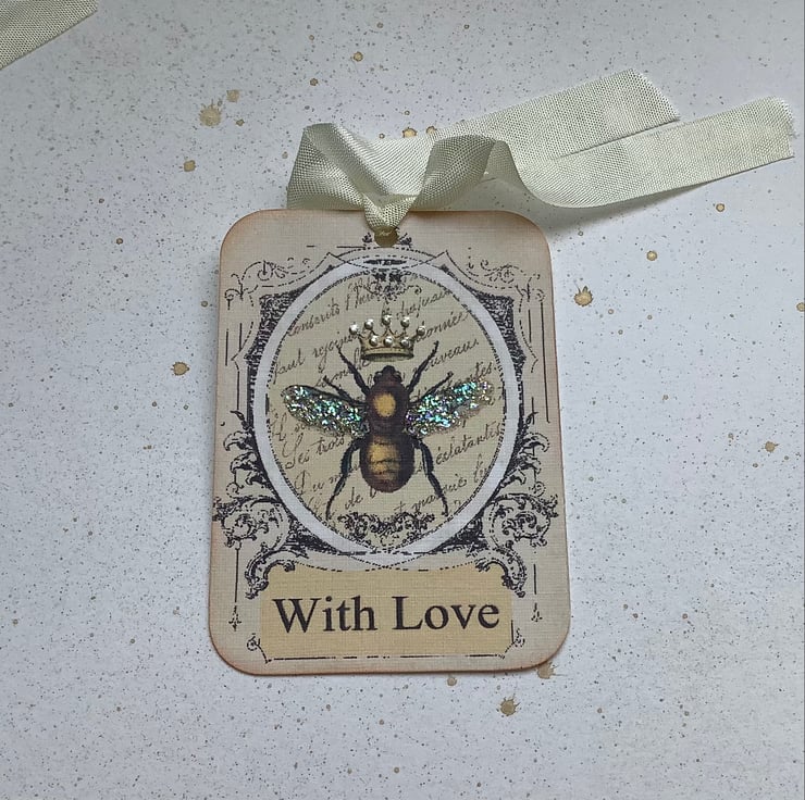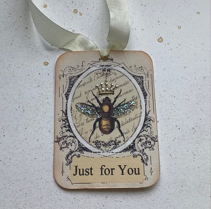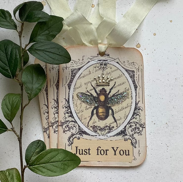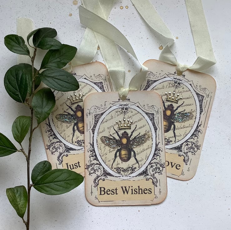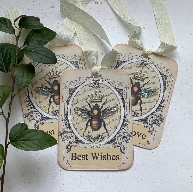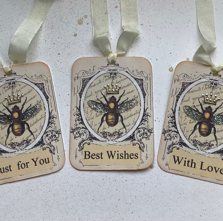 Lovely vintage image of a Queen Bee on script background, with a different sentiment on each tag .I have printed on to high quality linen-look (285gsm) card . Of course there has to some shimmer! and so I have added the necessary pearl 'drops' to the crown and the wings are iridescent glitter . Tied with elegant ,silky ,vintage -style ribbon !!