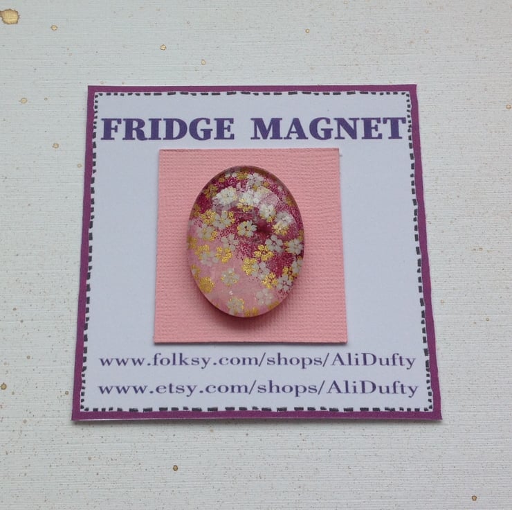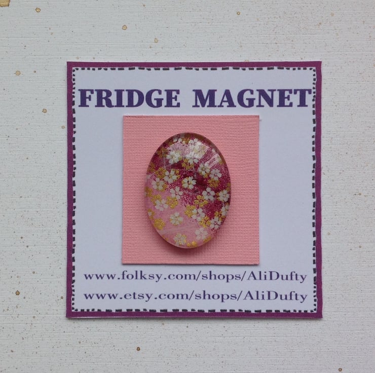 I have created this fridge magnet using gorgeous screen- printed , Japanese yuzen/ chiyogami paper . It has a clear , domed, glass cabochon over the paper which slightly magnifies the images underneath . There is a strong, thin , neodymium magnet on the reverse side .