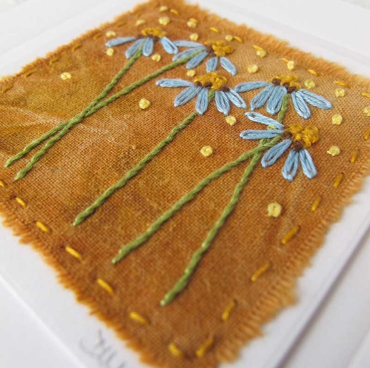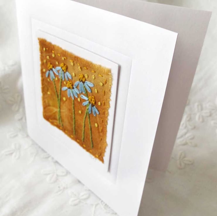 This beautiful card has been embroidered by hand onto rust printed fabric. The embroidery design is of daisy style flowers in blue on a lovely rich orange/tan background - the rust elements in the water give the hand dyed fabric this beautiful colour. The card is perfect for a special occasion, or perhaps framing it as it is. It has been mounted on a card base and is surrounded by an embossed square. The card has been left blank for your own message.