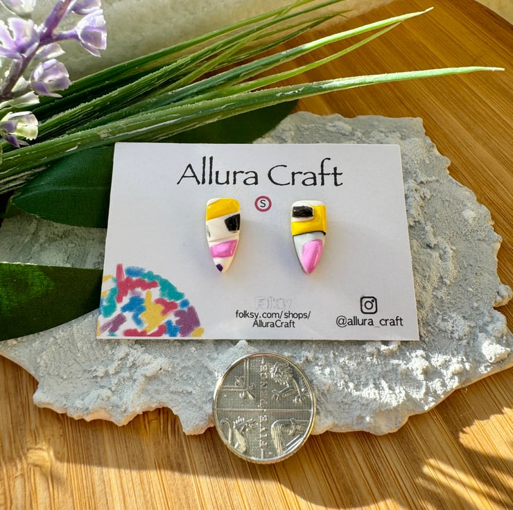 With a white polymer clay base and abstract random placed colour pops of pink, yellow and black