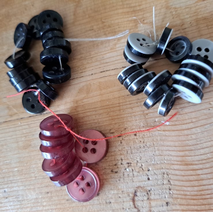 Sixteen dark grey buttons with white backs at 10mm, this time including seven smaller ones.
