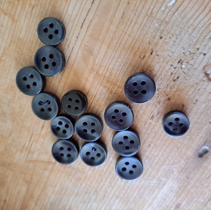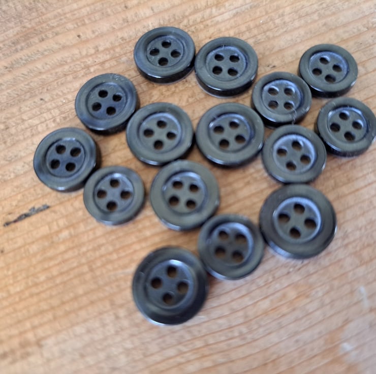 Fifteen black buttons, measuring just under 10mm, including four smaller cuff and collar versions.
