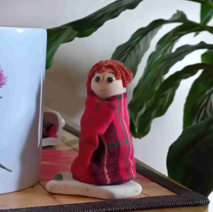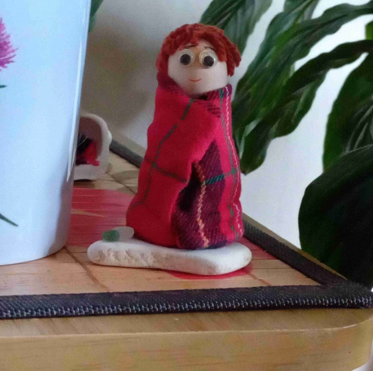 A wooden doll crafted into a Scottish lady on a blustery Scottish beach with some found seaglass sat on the base of found seapottery, possibly a vase base.