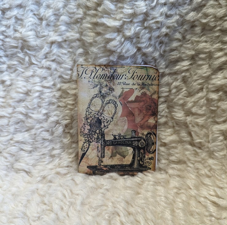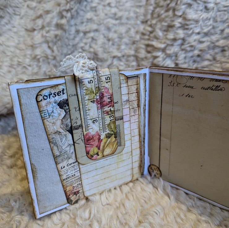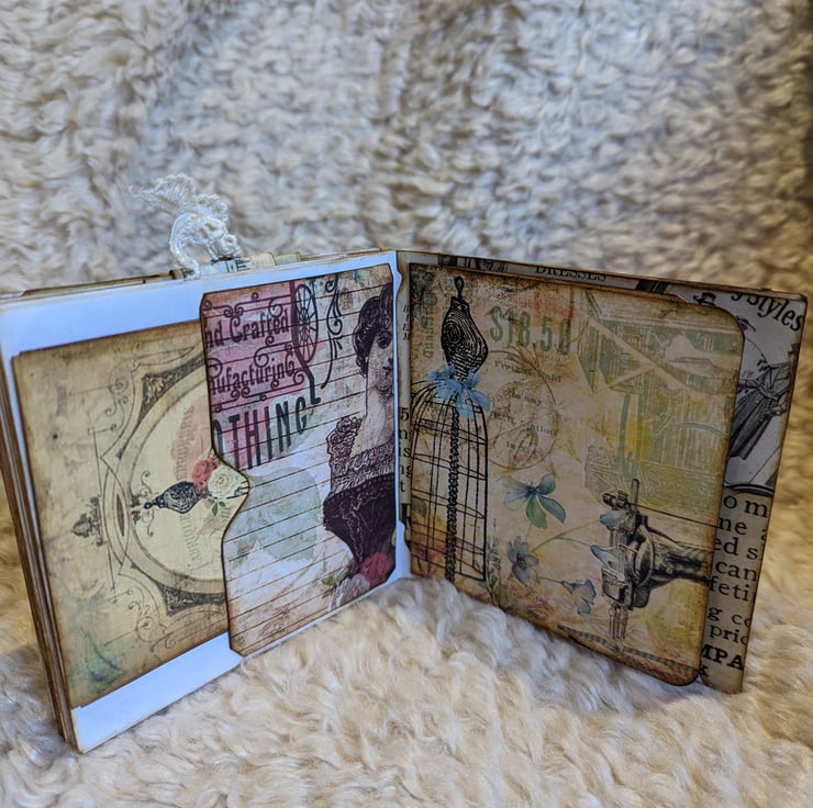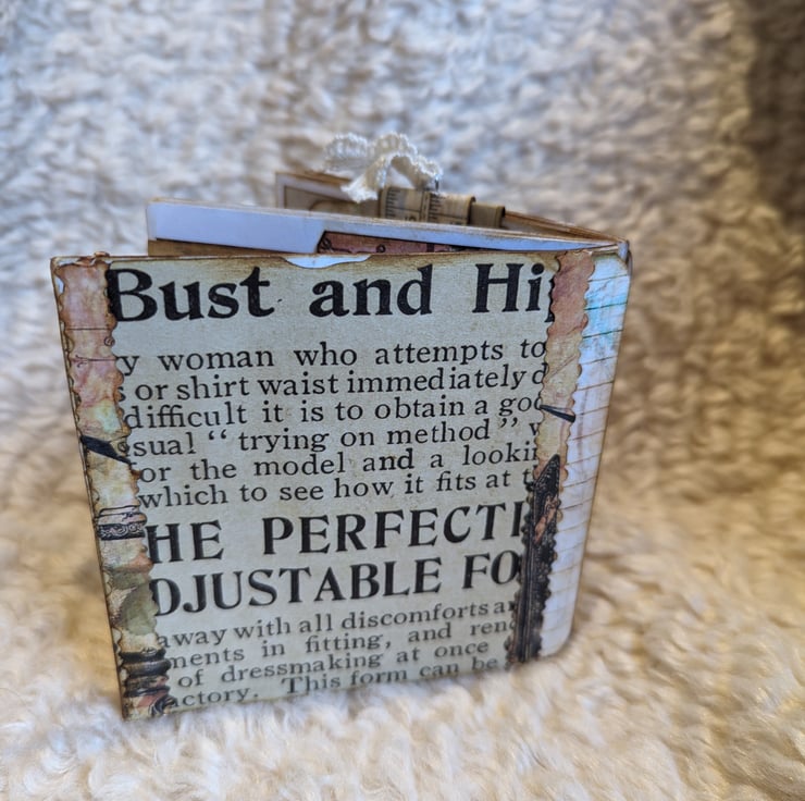 4 1/4 x 4 1/4 inch journal covered in newspaper clipping/jagged edged card stock, and a die cut ladies dress