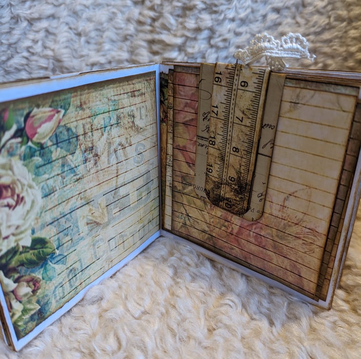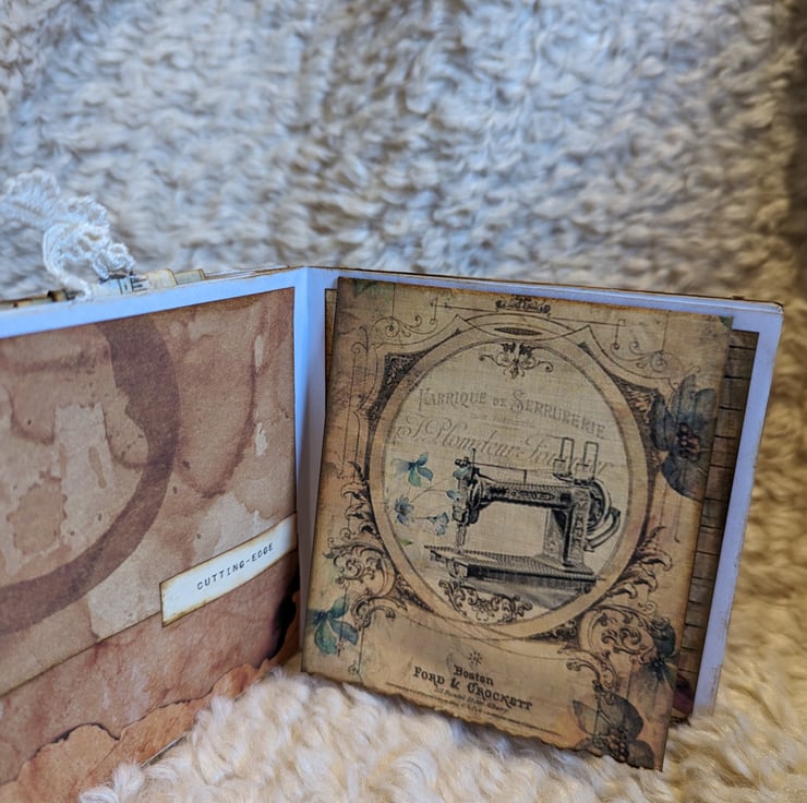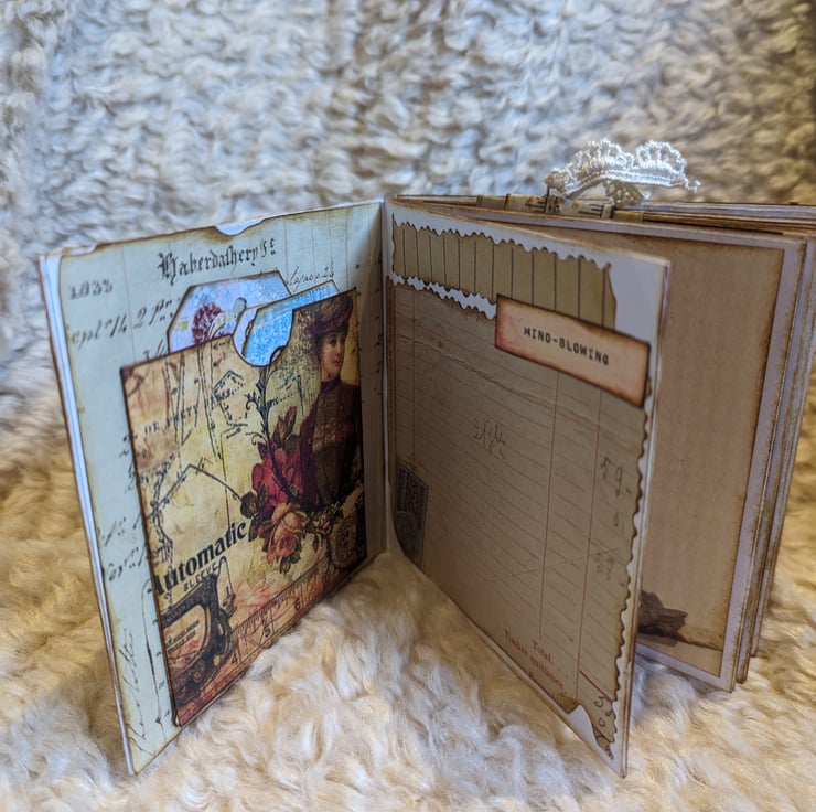 Thick pages adorned with neutral/beige papers of all kinds and decorated here and there - stickers, flip up, extra writing space