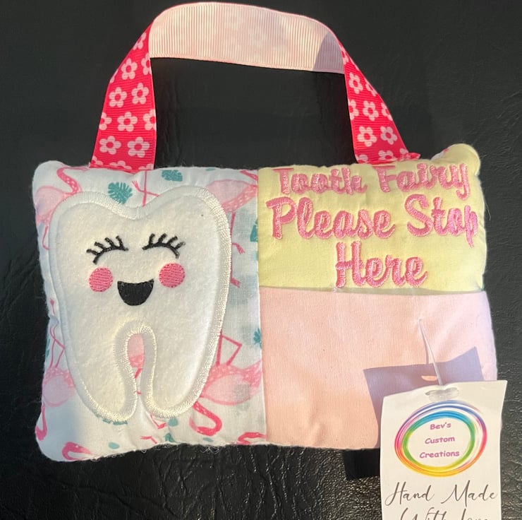 Embroidered Tooth fairy Pillow, Flamingo material tooth