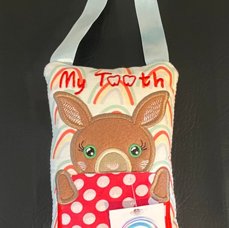 Handmade embroidered Tooth fairy pillow, no more searching for your little ones tooth under there pillow, just hang this little cushion on the door and place the tooth in the pocket.