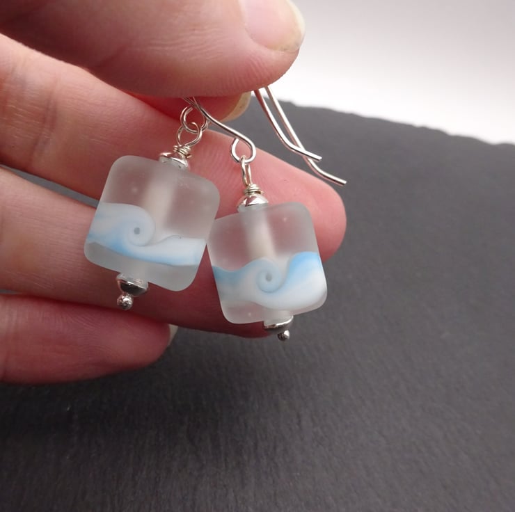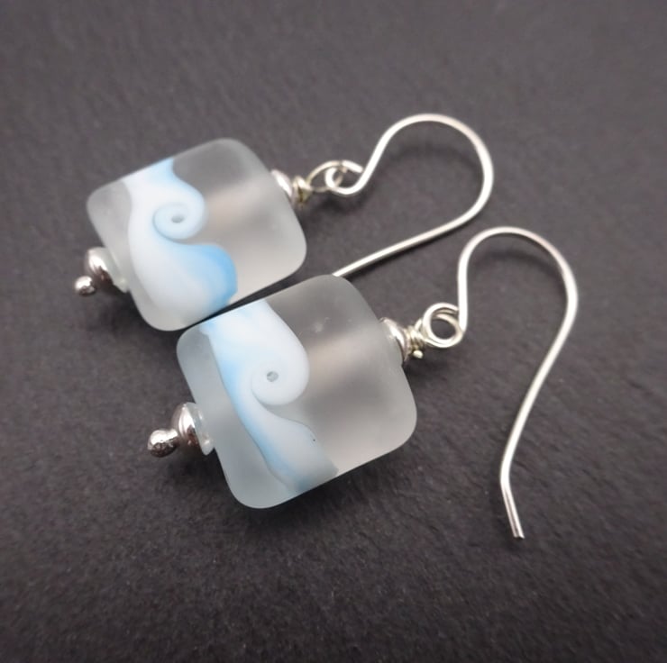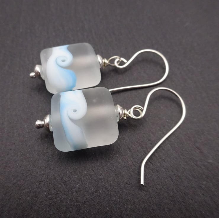 The lampwork beads have been handmade by me using clear glass with a blue swirl, they have been shaped and tumbled to give a smooth finish.