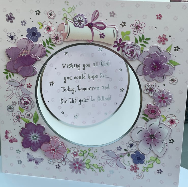 A lovely and feminine card to wish someone all the best on their birthday. This 15x15cm card is heavily embellished with decoupaged flowers around a circular aperture. The design features many layered flowers as well as printed and foiled butterflies and flowers. There is a scroll tied with a ribbon decoupaged to the top.The aperture is foiled and opens to a greeting inside that says Wishing you all that you would hope for...Today, tomorrow and for the rest of the year. Delicate and feminine.