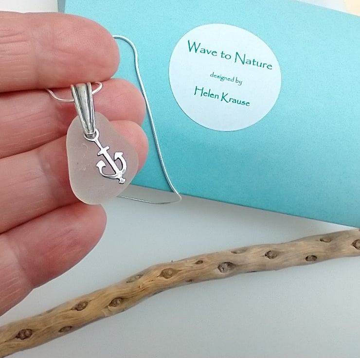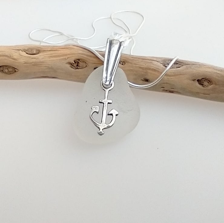 Naturally tumbled by the ocean, white sea glass coupled with a dainty sterling silver ship anchor charm on a sterling silver bail suspended on a sterling silver snake chain. This sea glass has been hand collected from the beach at Seaham and washed in soapy warm water afterwards. No other treatment has been given to this pretty nautical necklace. Each piece of sea glass is different and no two pieces are the same as they all have different shapes and textures due to the random tumbling they are exposed to by the waves of the sea.