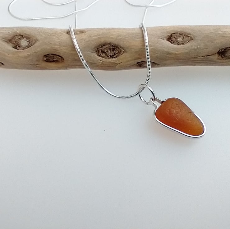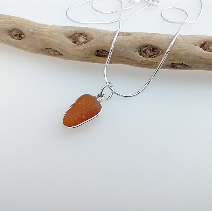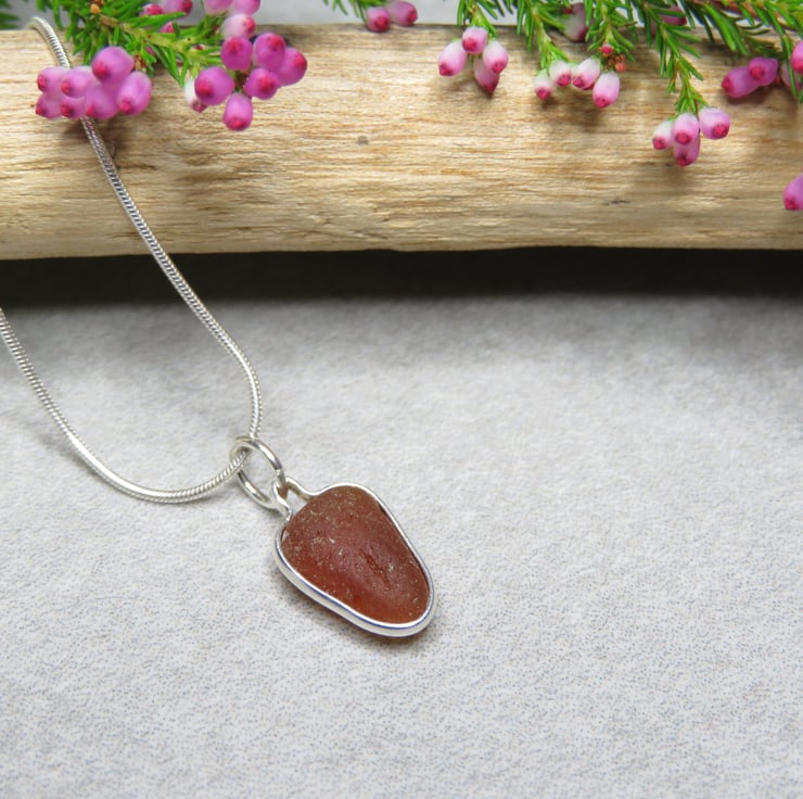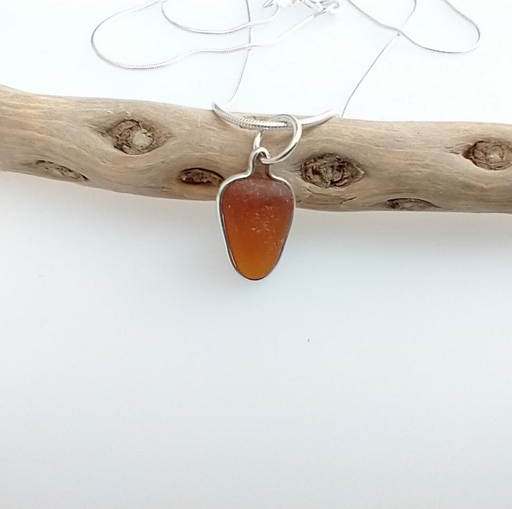 Naturally tumbled by the ocean, a dainty brown sea glass pendant in a sterling silver bezel suspended on a sterling silver snake chain. This sea glass has been hand collected from the beach at Seaham and washed in soapy warm water afterwards. No other treatment has been given to this pretty necklace. Each piece of sea glass is different and no two pieces are the same as they all have different shapes and textures due to the random tumbling they are exposed to by the waves of the sea.
