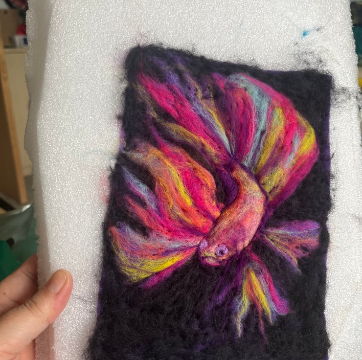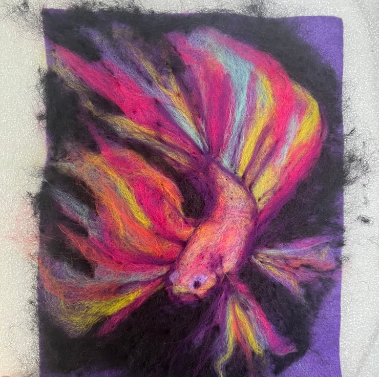 A multicoloured Betta fish against a contrasting background. A4 when mounted. Handmade wool painting needle felt wall art