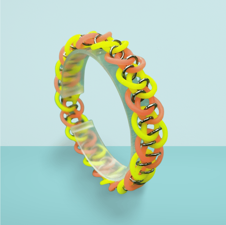 Choose from various colours for the rubber rings and select either a gold or silver base. Available in sizes from 6" to 10" with a 15mm width, this gender-neutral bracelet slips on easily without a clasp, blending unique style, durability, and comfort.