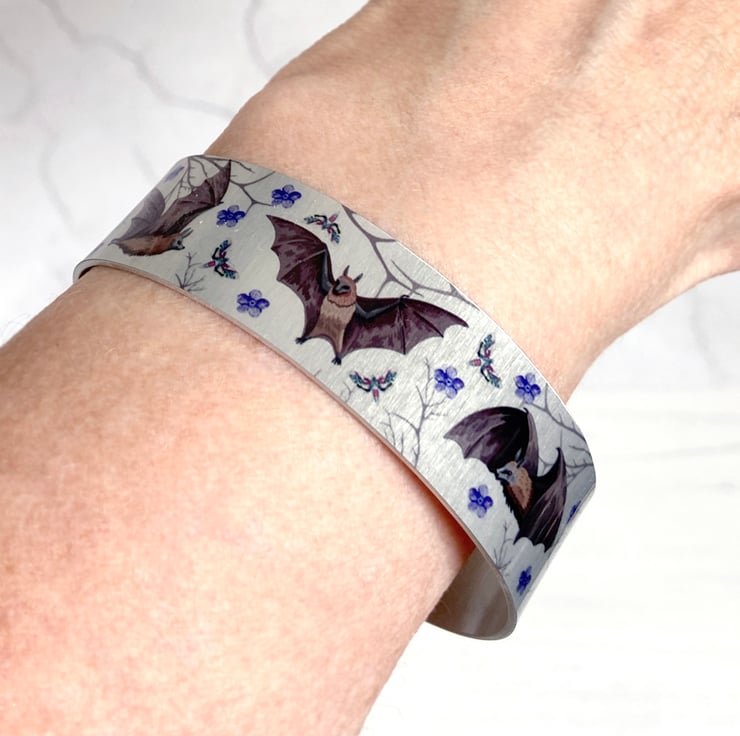 Cuff bracelet, metal bangle with a bat design, with moths and blue flowers, on a brushed silver background. Handmade jewellery which would make an ideal gift for a wildlife lover of these nocturnal creatures. In addition, for a small fee, a personal message can be engraved on the reverse (Optional).