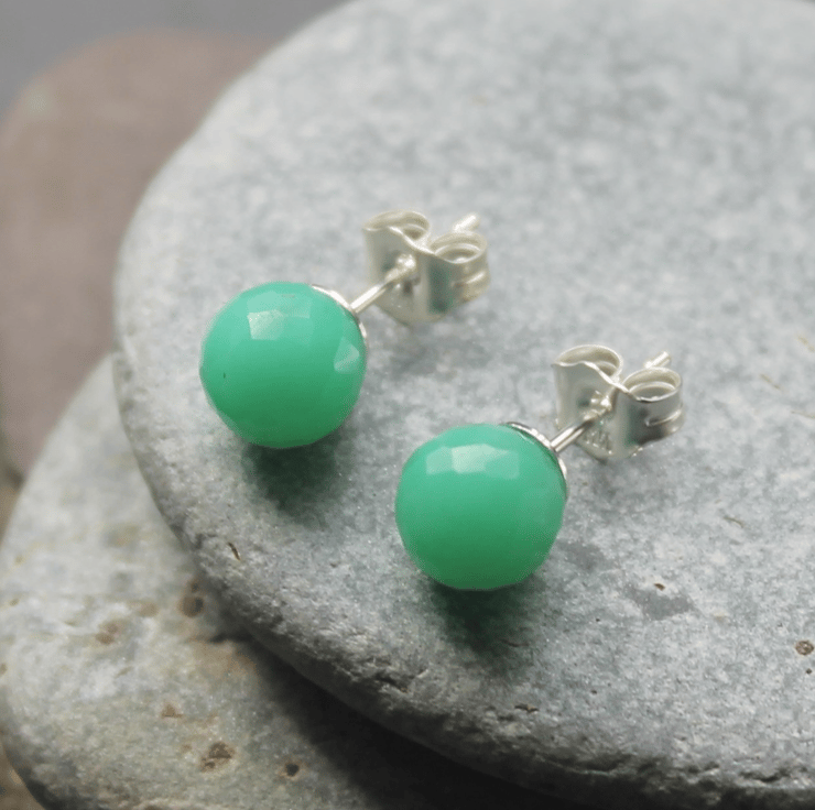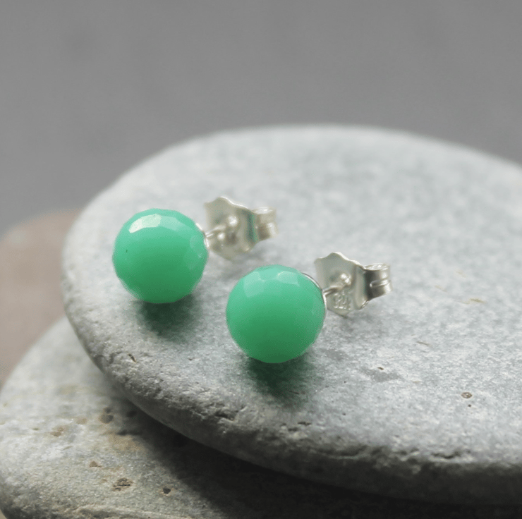 A pretty pair of delicately micro faceted 6mm chrysoprase rounds on sterling silver studs. The seafoam light green facets sparkle perfectly in the light and would make a perfect pop of colour to your day.
