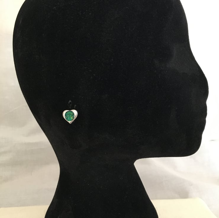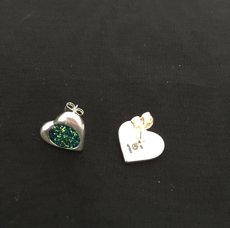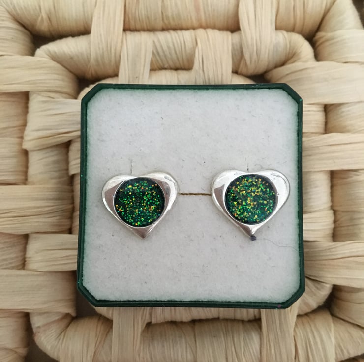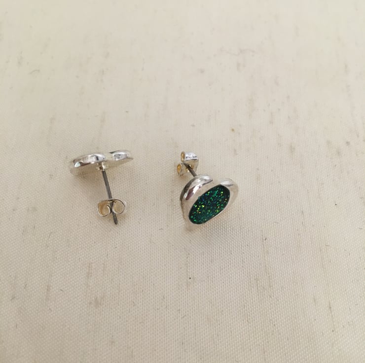 The handmade centrepieces are created using a gold and green glitter mix base with a 2 part resin mix overlay. The colours gently reflect the light and therefore can be worn as day or evening wear. The studs centre measures 8mm and the widest part 14mm.