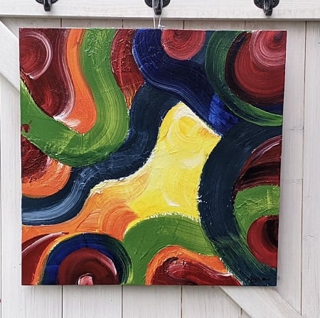 An original one-off acrylic painting on textured hand-cut board by Cambridgeshire Artist, Rachel James, Freedom is 48.5cm x 48.5cm x 1.5cm.