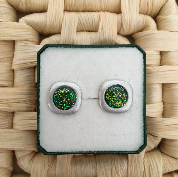 The handmade centrepieces are created using a gold and green glitter mix base with a 2 part resin mix overlay. The colours gently reflect the light and therefore can be worn as day or evening wear.