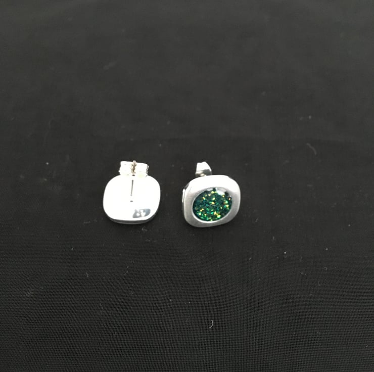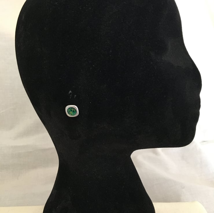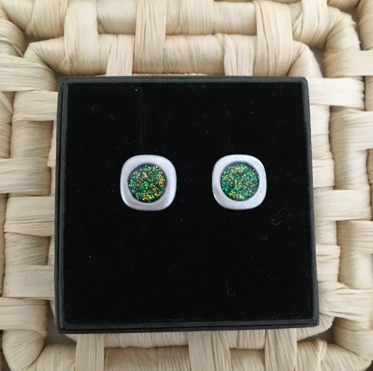 Pretty handcrafted stud earrings that shimmer in a satin silver tone setting