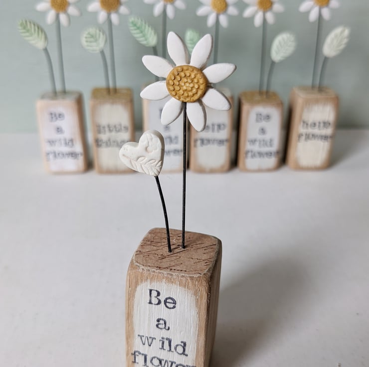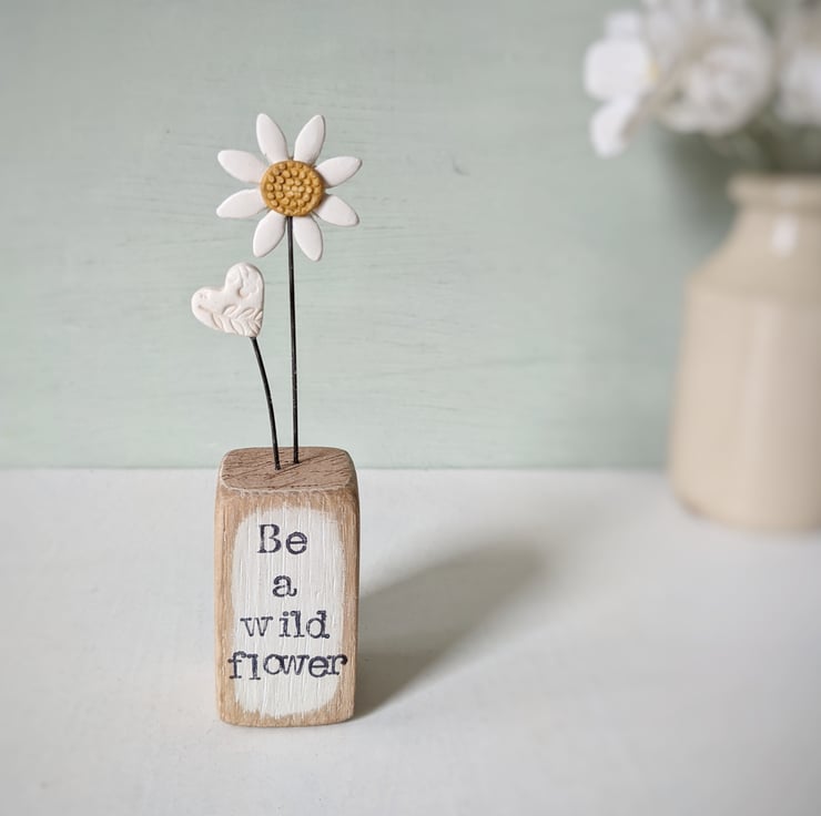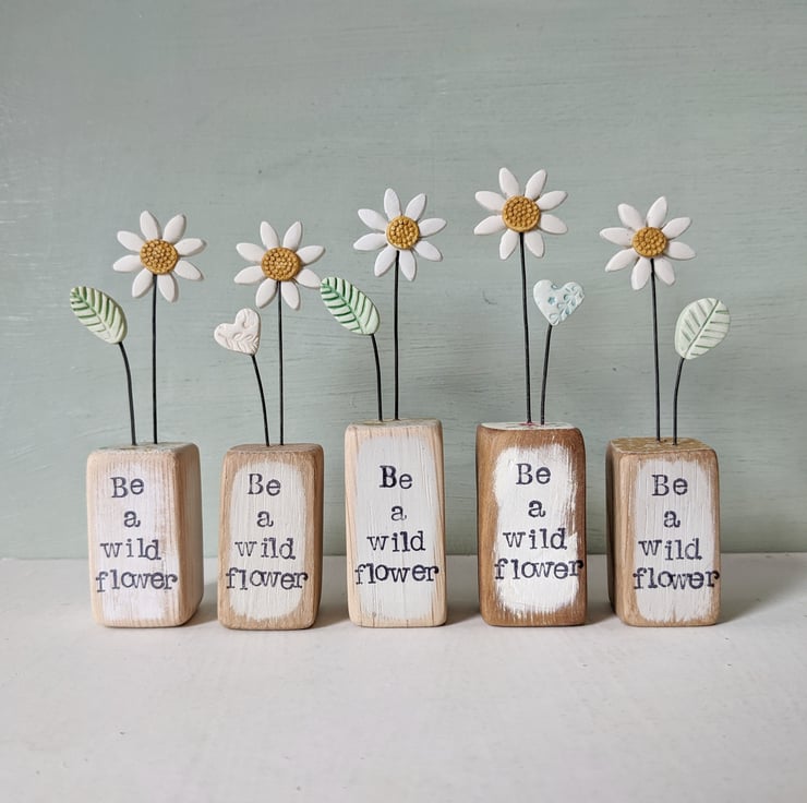 The front of the wooden block is hand stamped with the words 'Be a wild flower'