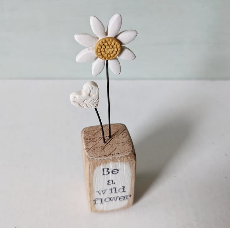 The clay daisy flower and heart are made from polymer clay. This is hand moulded and patterned, fired and painted to finish.